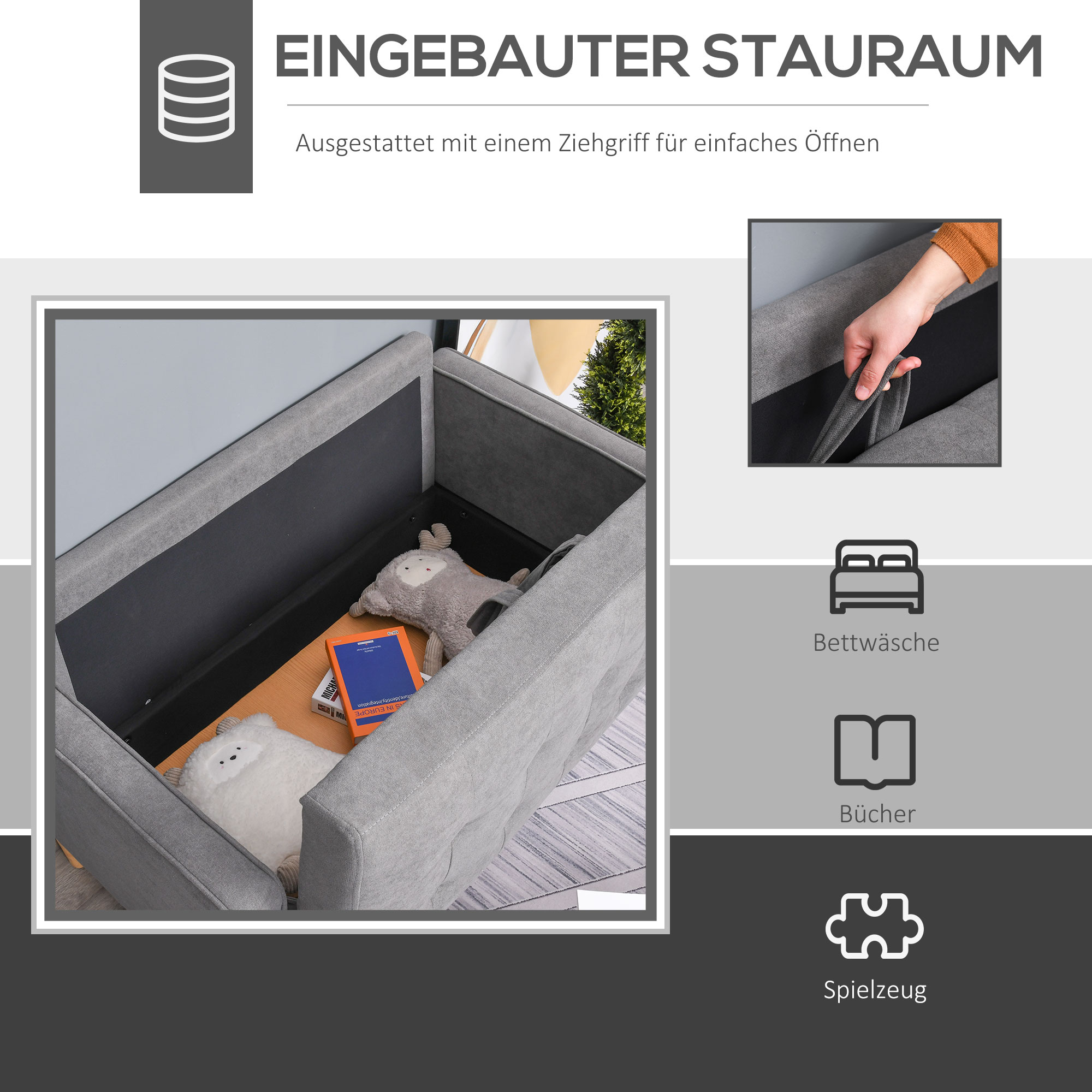 • Unter dem Sitz verborgener Stauraum bietet ausreichend Platz für Bettzeug, Bücher und Alltagsgegenstände
