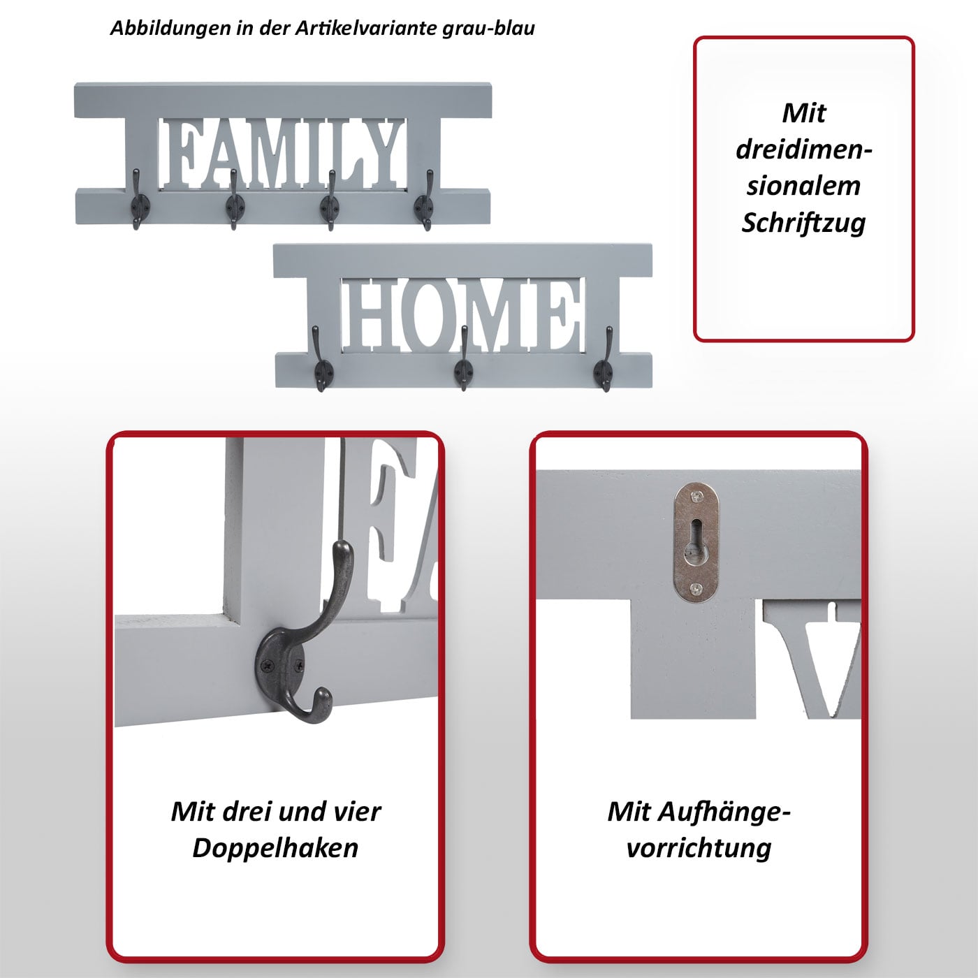 - Garderobe 2 (mit Schriftzug „Home“): ca. 21 x 55 x 7 cm (H x B x T)