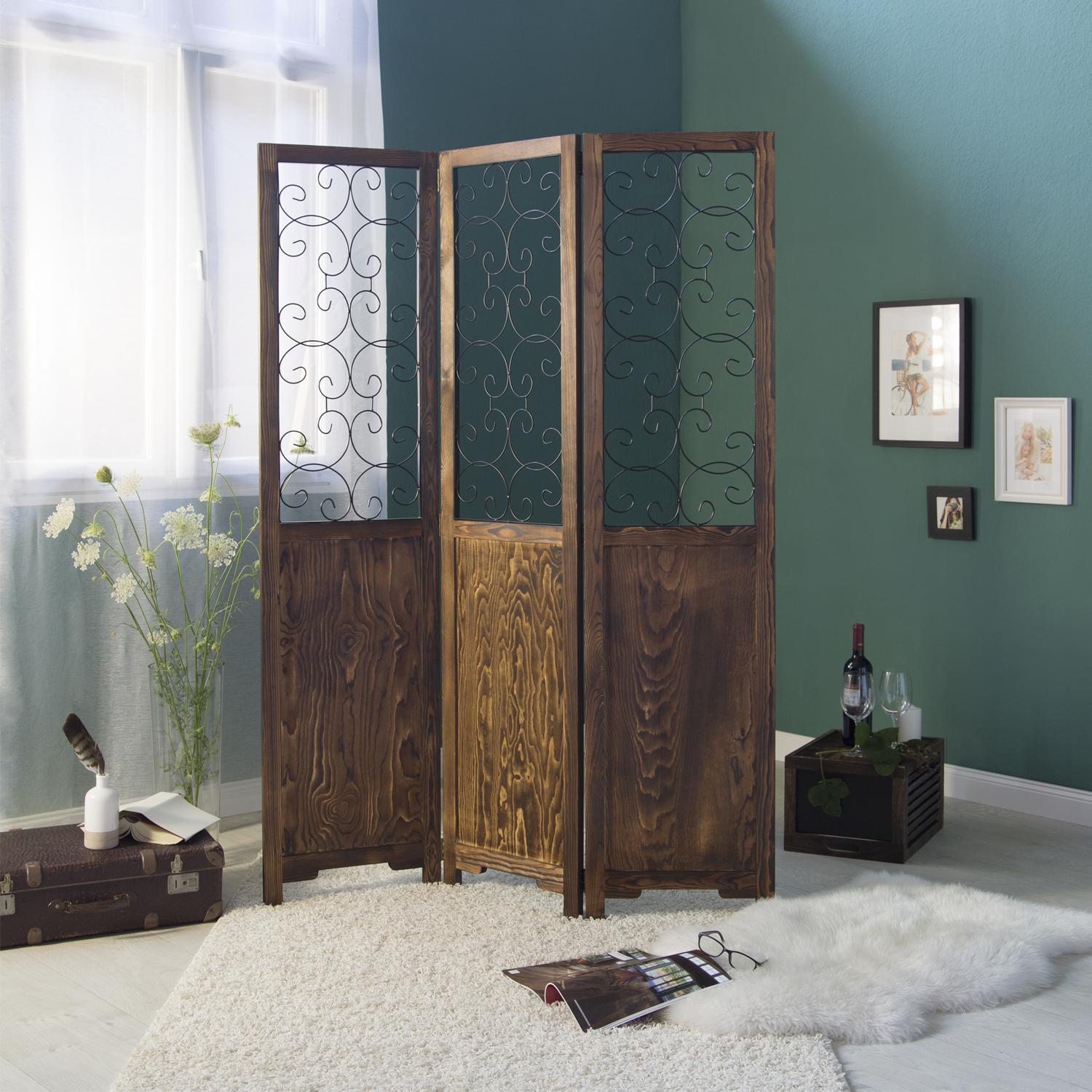 Mit diesem 3-teiligen Paravent lassen Sie ein neues Wohngefühl in Ihr Zuhause einziehen – als stilvoller Raumtrenner oder Teil-Sichtschutz sorgt dieser für eine behagliche Atmosphäre in jedem Wohnbereich. Der stabile Rahmen und untere Teil des Paravents bestehen aus schwarz-braun lasiertem Kiefernholz, welches die Holzstruktur durchscheinen lässt.