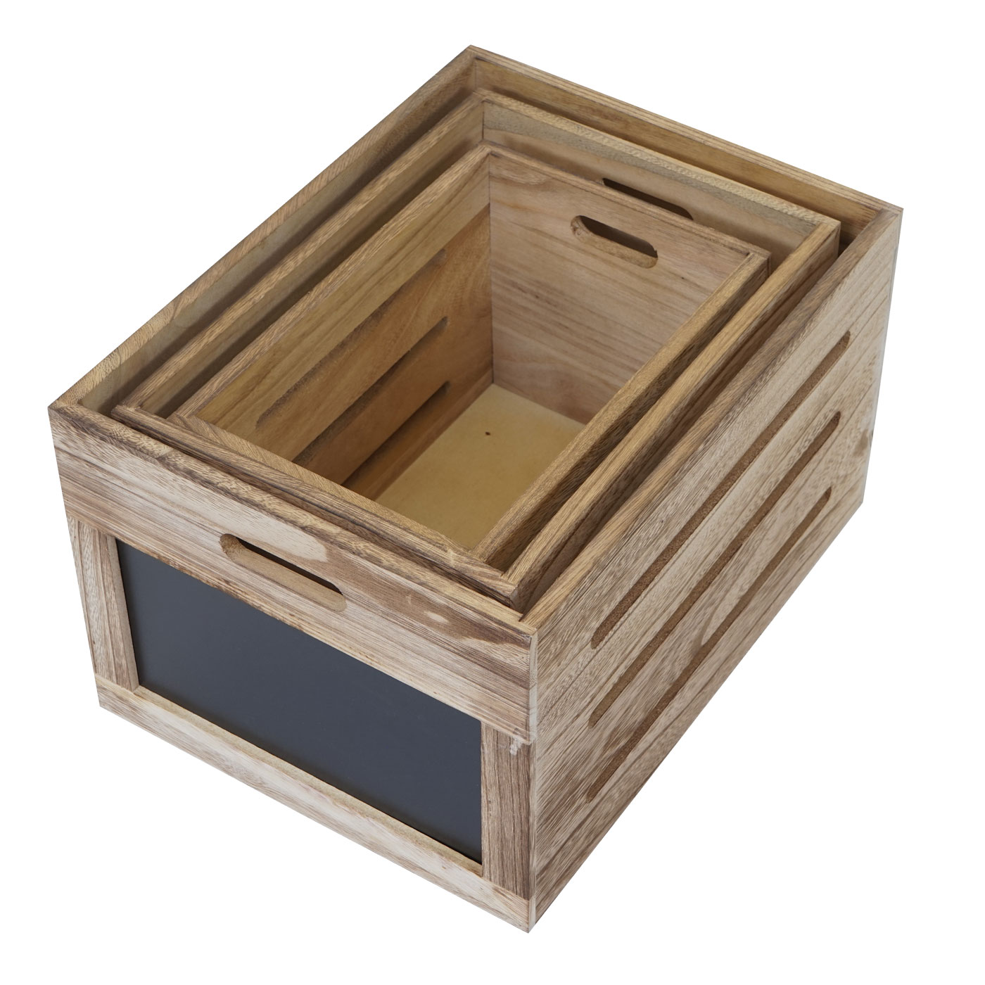 - Drei Holzkisten in unterschiedlichen Größen: S, M und L
