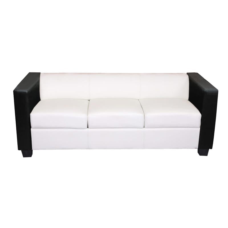 Dieses stilvolle 3-Sitzer Sofa im modernen Lounge-Stil überzeugt durch einen attraktiven Farb- und Materialmix. Die Kombination aus weißem Kunstleder und schwarzen Armlehnen aus beschichtetem Spaltleder macht das Sofa zu einem echten Blickfang für Wohnzimmer, Büro oder Lounge-Bereich. Dank der bequemen Sitzpolsterung und der vielseitigen Kombinierbarkeit ist dieses Sofa die perfekte Wahl für alle, die Wert auf Komfort und außergewöhnliches Design legen.