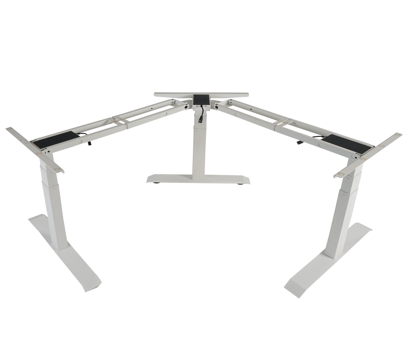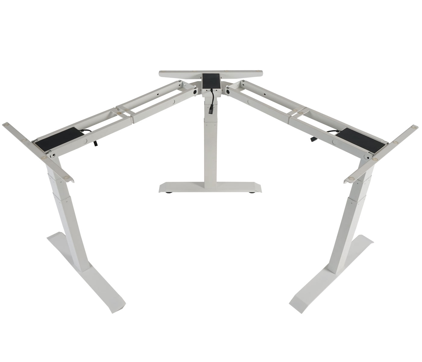 Sie möchten einen ganz individuellen und auch variablen Schreibtisch? Mit unserem höhenverstellbaren Gestell ist das kein Problem mehr. Durch die 3 Winkeleinstellungen lässt sich dieses praktische Gestell ganz nach Ihren Bedürfnissen mit Ihrer Tischplatte kombinieren. Ganz egal ob 90°, 120° oder 180° – dieses Gestell lässt keine Wünsche offen. Lassen Sie sich eine Tischplatte ganz nach Ihrem Platzangebot anfertigen und montieren Sie diese dann auf unserem Tischgestell. Dieses kann mithilfe dreier Motoren stufenlos verstellt werden. Dank der Memory-Funktion können Sie die vier meistgenutzten Positionen speichern, sodass nach den ersten Versuchen in verschiedenen Höhen nur noch programmiert werden muss. Mehr Beinfreiheit wird durch querstangenfreies Design gewährleistet.