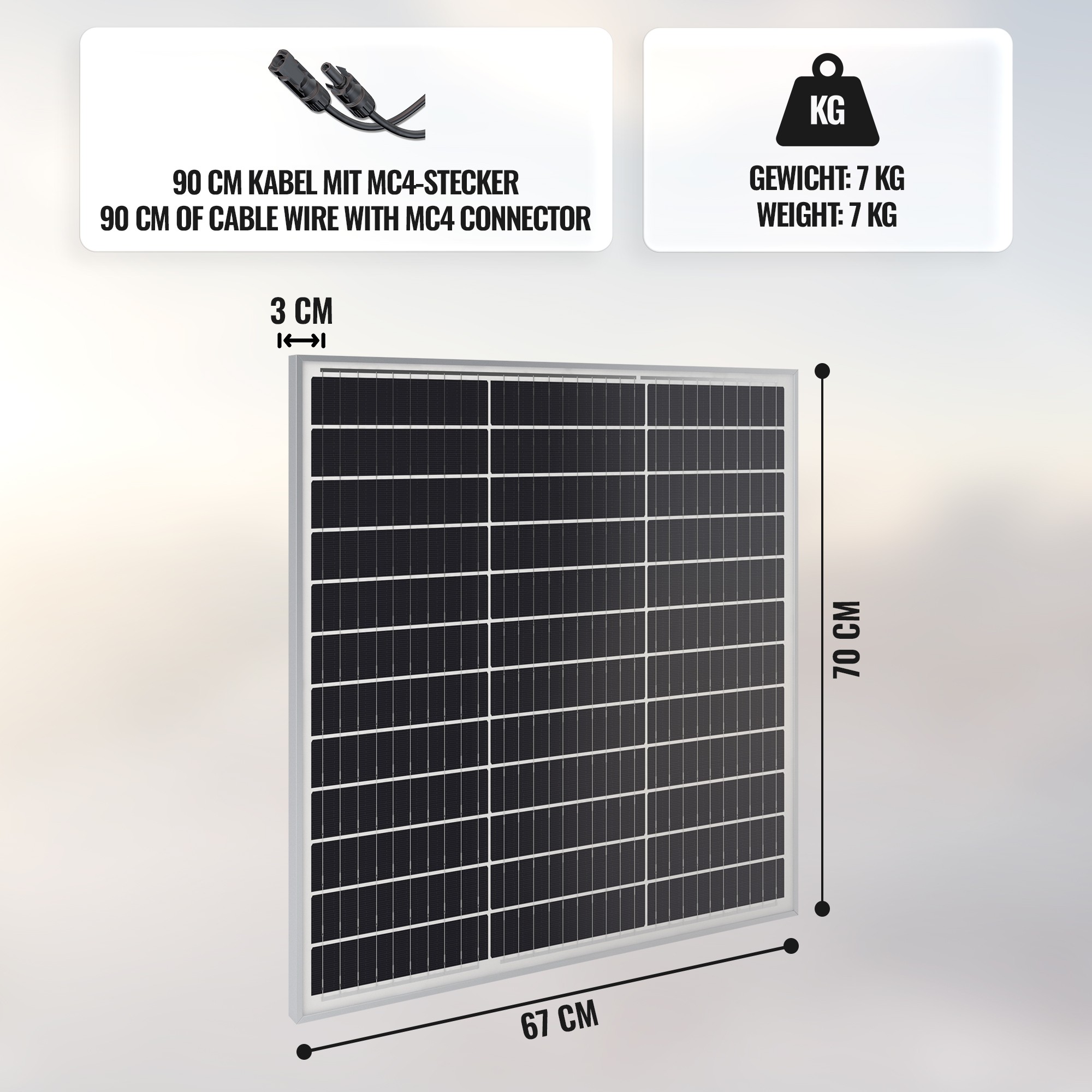 - Hocheffizientes 100W monokristallines Solarpanel: ca. 700 x 670 x 30 mm