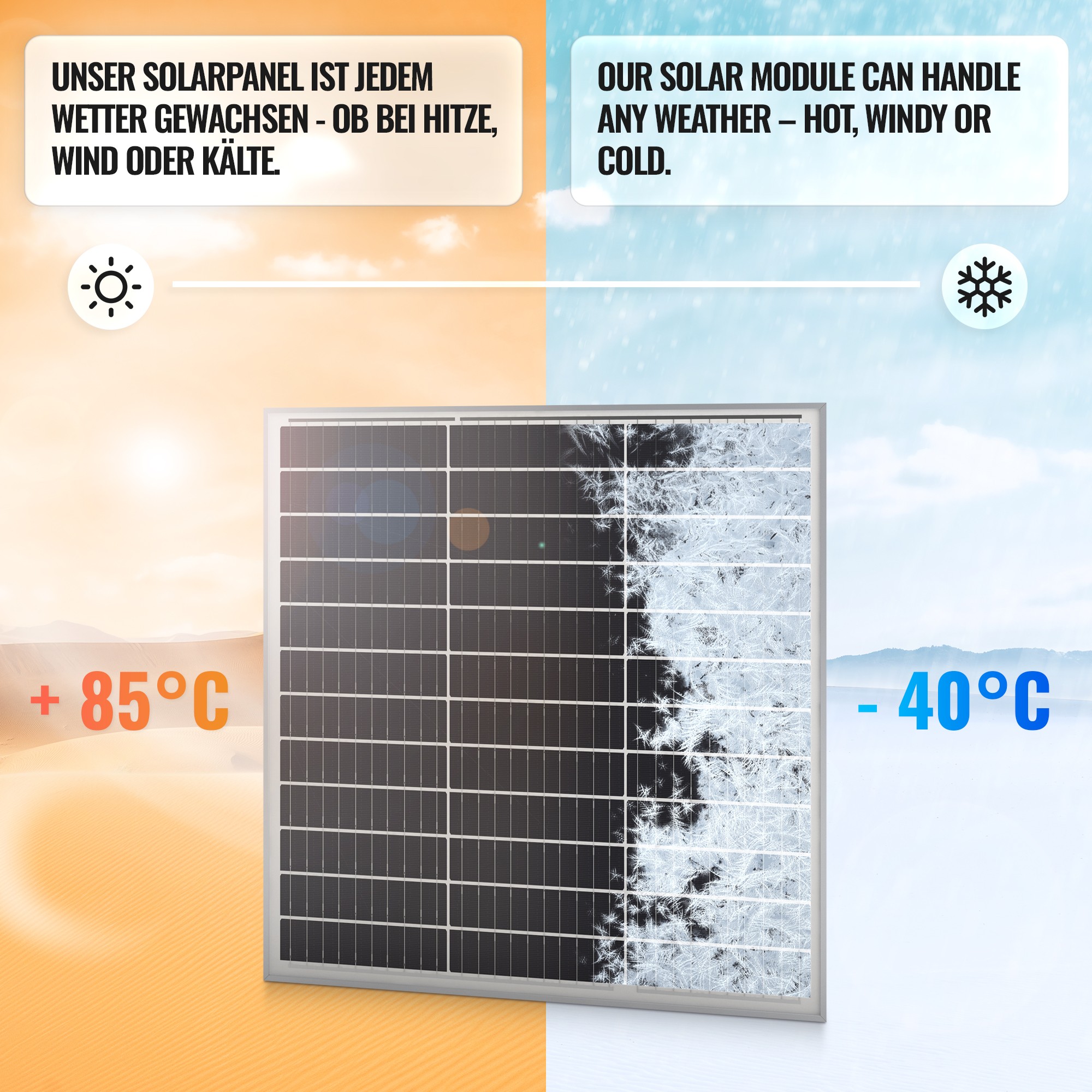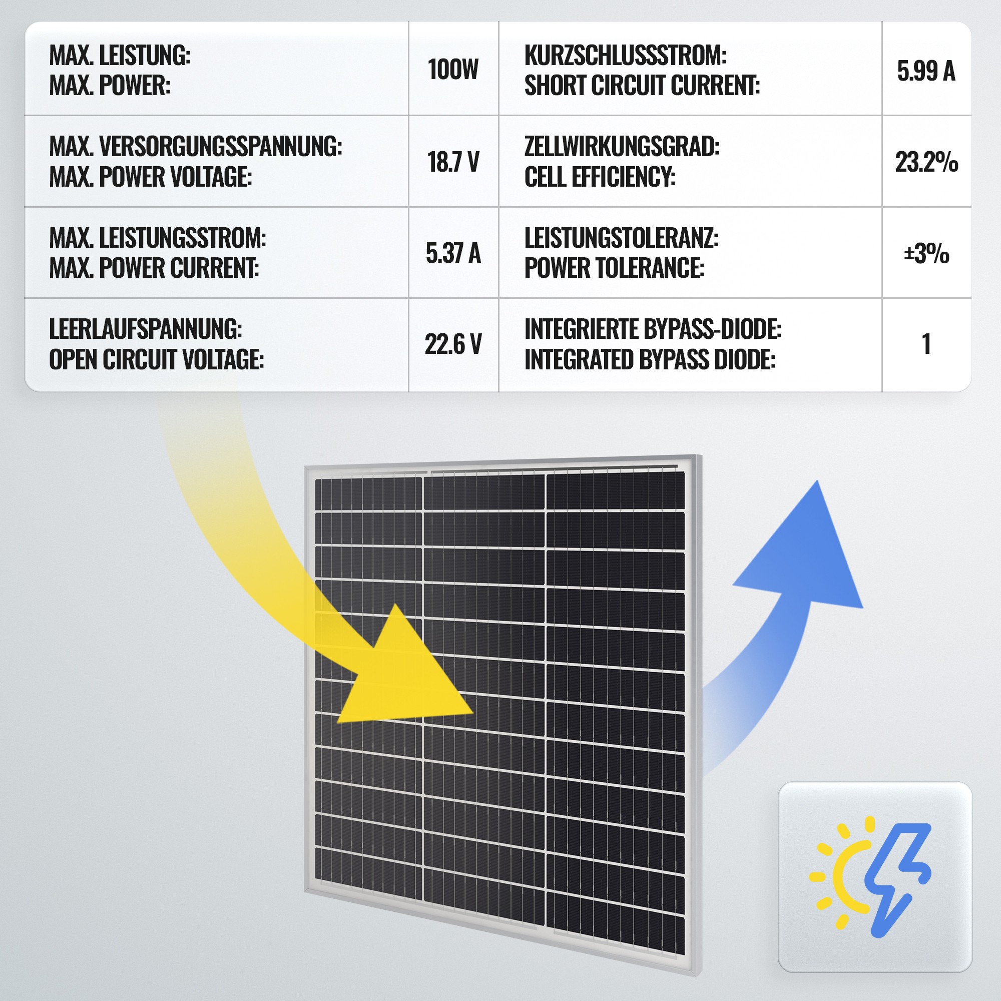 • Hocheffizientes 100W monokristallines Solarpanel: ca. 700 x 670 x 30 mm