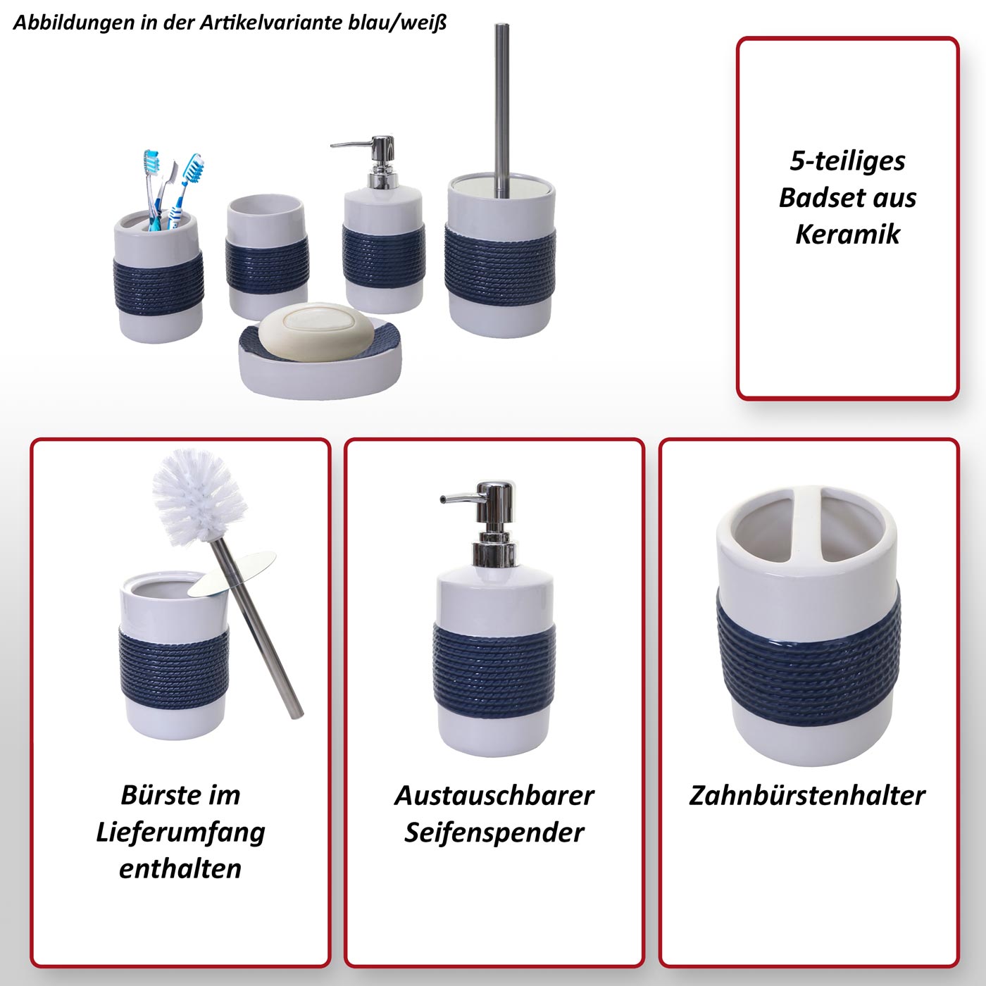 Das Badezimmerset enthält die 5 wesentlichen Badutensilien aus hochwertiger Keramik in einer trendigen Farbe. Mit den farblich aufeinander abgestimmten Utensilien können Sie in Ihrem Badezimmer trendige Akzente setzen und fast jedes Ambiente aufpeppen.
