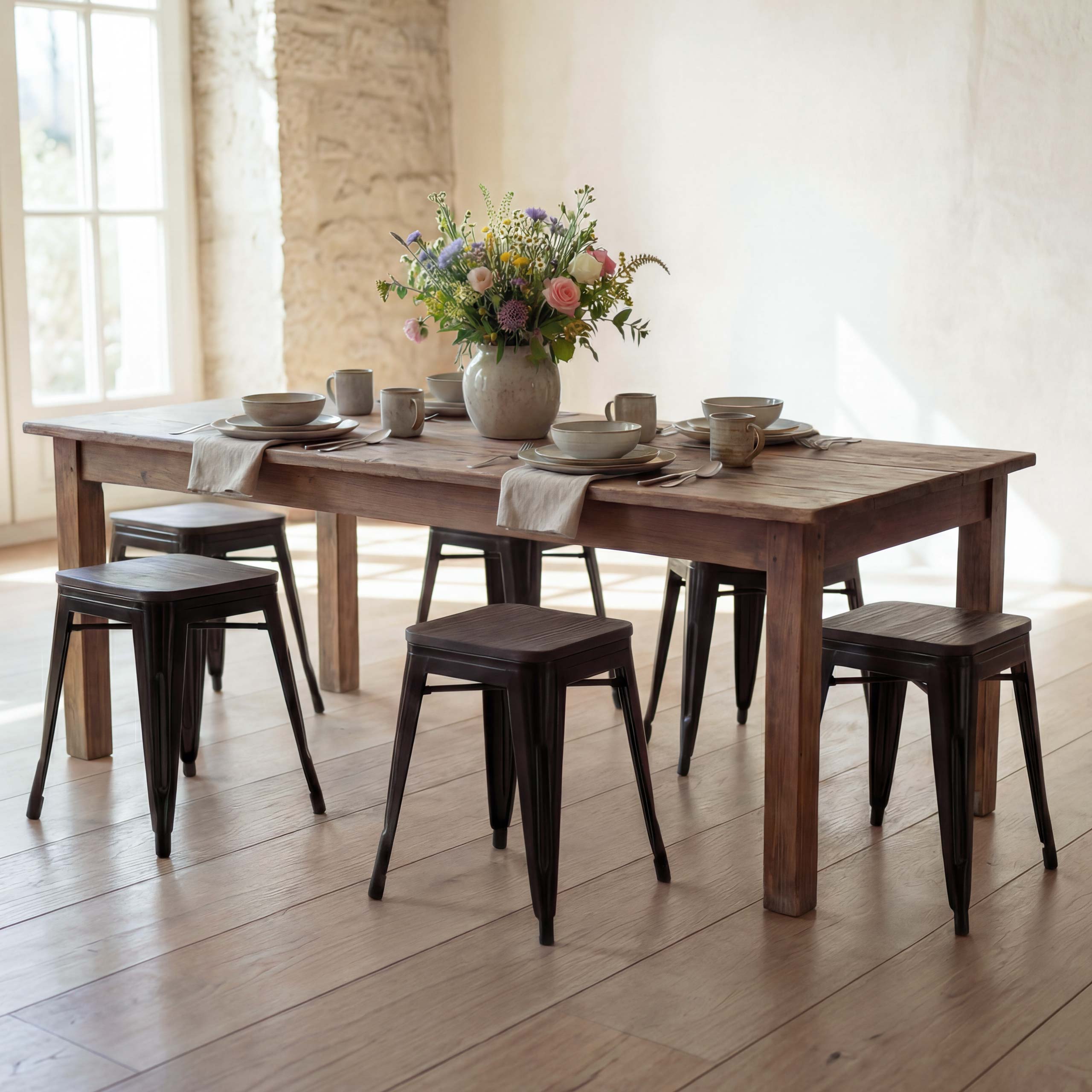 Stapelbare Hocker aus Metall und Ulmenholz – Industrielles Design für vielseitige Einsatzbereiche