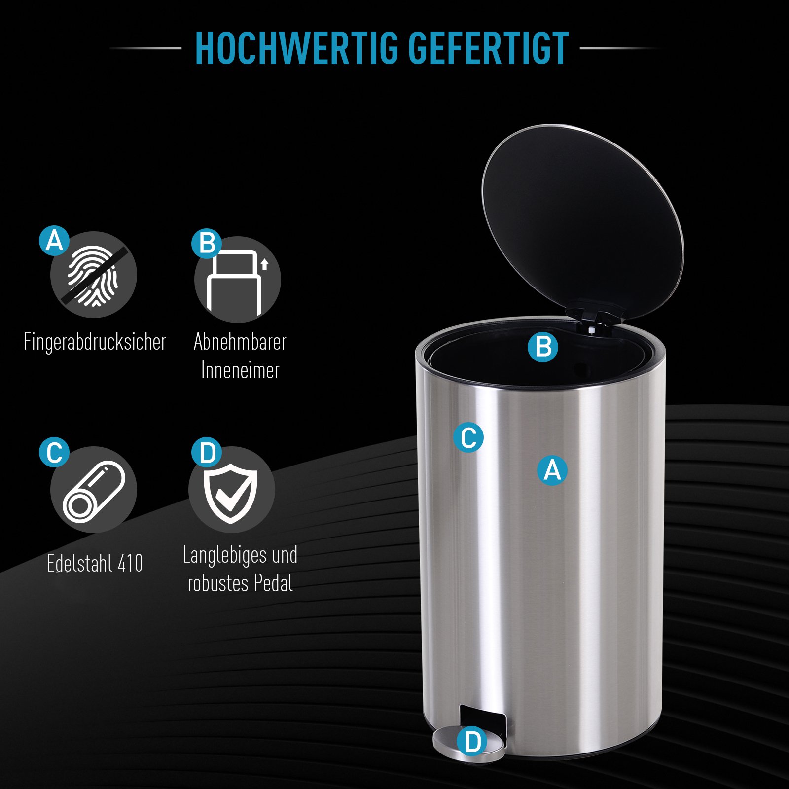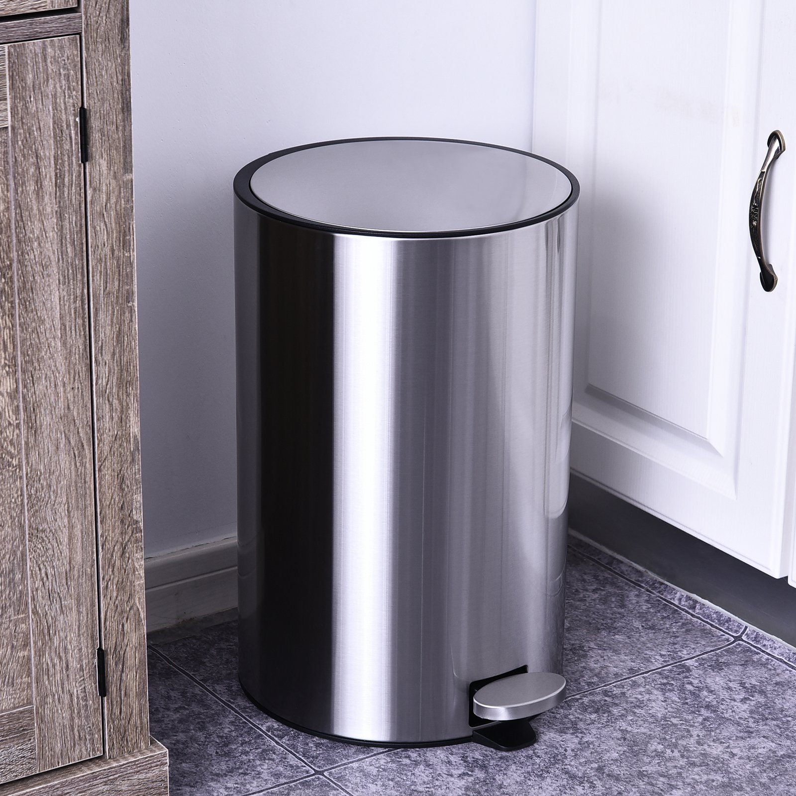 Kaufen Sie einen starken und leisen M&uumllleimer, f&uumlr einfachere Hausarbeit. Unser M&uumllleimer aus Edelstahl in schlichter und sauberer Optik passt perfekt zu Ihrem vorhandenen Dekor und ist auch ideal f&uumlr den Einsatz in B&uumlros, Waschk&uumlchen, Badezimmern, K&uumlchen oder &uumlberall dort, wo ein M&uumllleimer ben&oumltigt wird. Der Soft-Verschluss-Deckel vermeidet Ger&aumlusche und Schl&aumlge, die st&oumlren k&oumlnnen. Das robuste und breite Pedal befreit Ihre H&aumlnde. Herausnehmbarer Inneneimer gew&aumlhrleistet eine saubere Verwendung. Ein Muss im t&aumlglichen Heim- und Arbeitsleben!