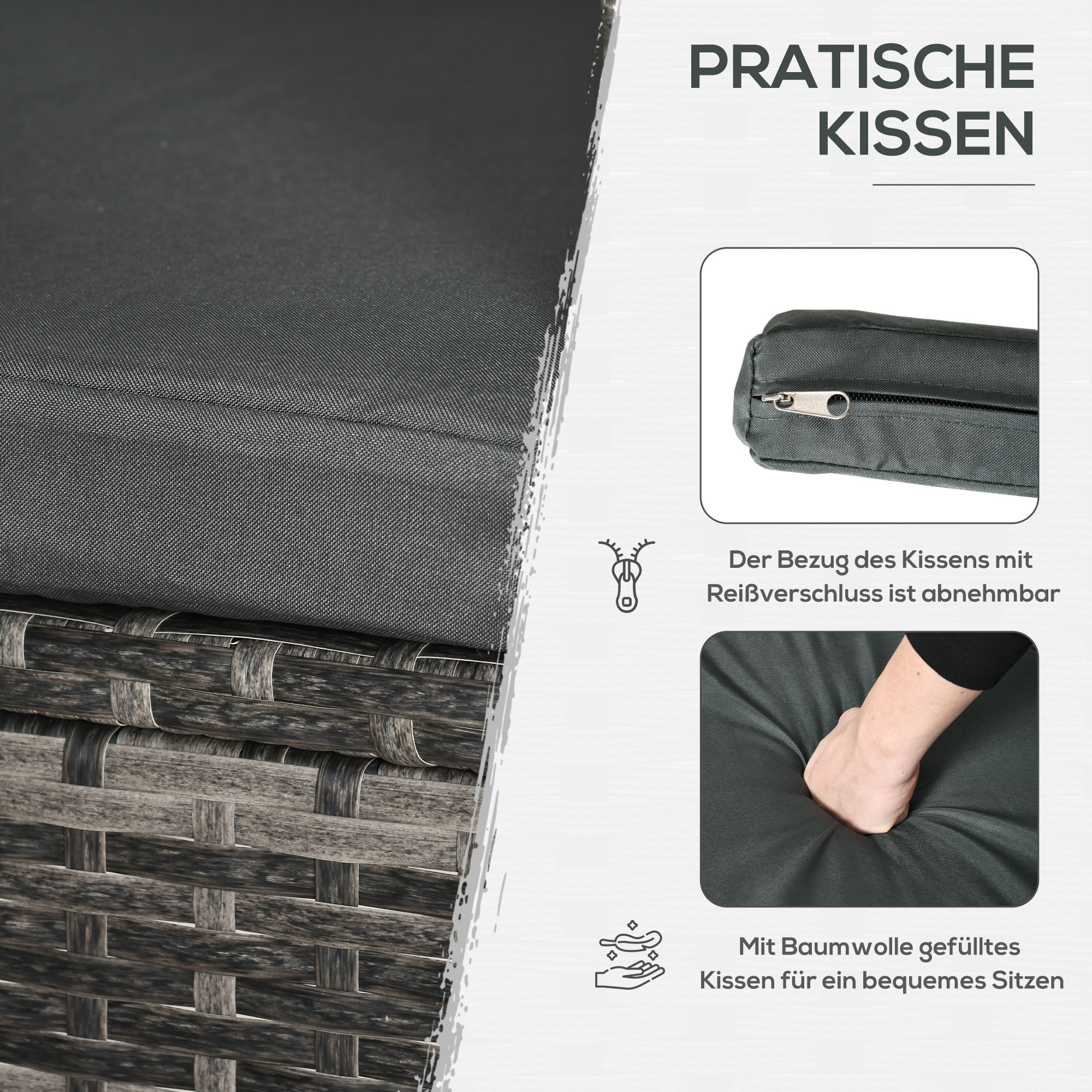 - Materialien: Metall. PE-Rattan. Polyester. Schaumstoff. gehärtetes Glas
