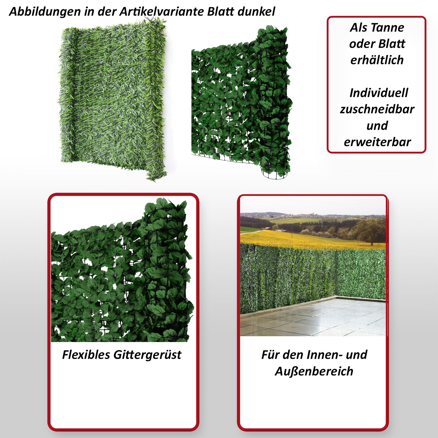 – Dieser blickdichte Balkonsichtschutz ist durch die mitgelieferten Kabelbinder schnell und einfach anzubringen. Individuell zuschneidbar und kreativ erweiterbar lässt diese Sichtschutzhecke in natürlicher Optik keine Wünsche offen.