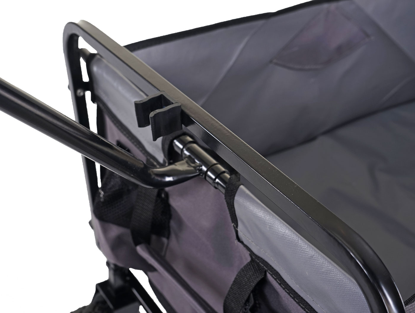 Der Wagen ist mit wenigen Handgriffen aufgebaut und schnell einsatzbereit. Zusammengeklappt kann er platzsparend verstaut werden. Der pflegeleichte Bezug des Handwagens wird mit Klettverschlüssen fixiert. Zwei Taschen für kleine Getränkeflaschen oder Dosen sind integriert. Die 360° drehbaren Vorderräder, eine stabile Zugstange und ein gepolsterter Handgriff sorgen für ein leichtes und bequemes Ziehen oder Schieben.