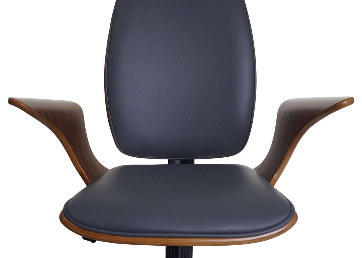 Dieser Bürosessel verleiht Ihrem Büro Klasse und Komfort. Das stilvolle Design fügt Gemütlichkeit hinzu, und die tolle Walnuss-Optik des Bugholzes harmoniert perfekt mit dem eleganten Lederlook. Die ergonomische Form der Sitz- und Rückenlehne unterstützt ergonomisch und sorgt für optimalen Sitzkomfort. Der weiche Kunstlederbezug ist pflegeleicht und der verchromte Fuß verleiht zusätzliche Eleganz.