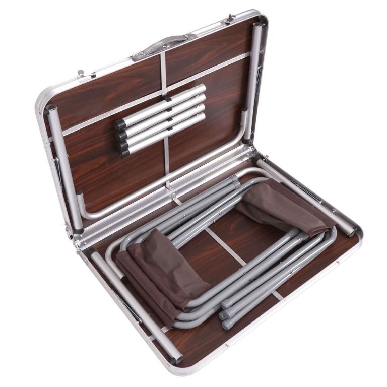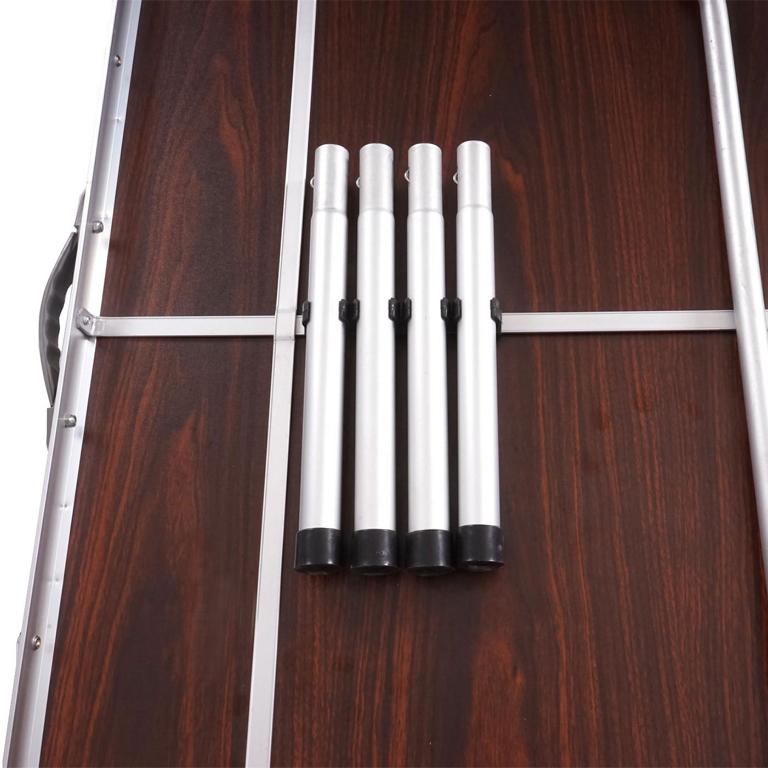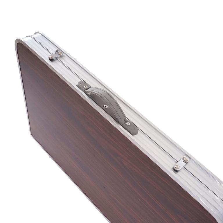 Klappen und – Action! Dieser Tisch ist der ideale Begleiter für alle, die Mobilität und Flexibilität lieben. Im Handumdrehen lassen sich die Tischbeine zusammenklappen und dank dem integrierten Griff an der Seite lässt sich der Tisch so angenehm wie ein Koffer tragen. Durch dieses Kofferprinzip ist dieser Tisch der ideale Begleiter für Camping, für den Garten oder die Terrasse. Das Gestell des Tisches wurde aus Aluminium gefertigt, wodurch er sogar kurzen Schauern standhält, ohne zu rosten. Auch als „Reserve“, wenn es einmal mehr Gäste werden sollten, eignet sich der Tisch sehr gut, da er schnell verstaut und wieder aufgebaut ist.