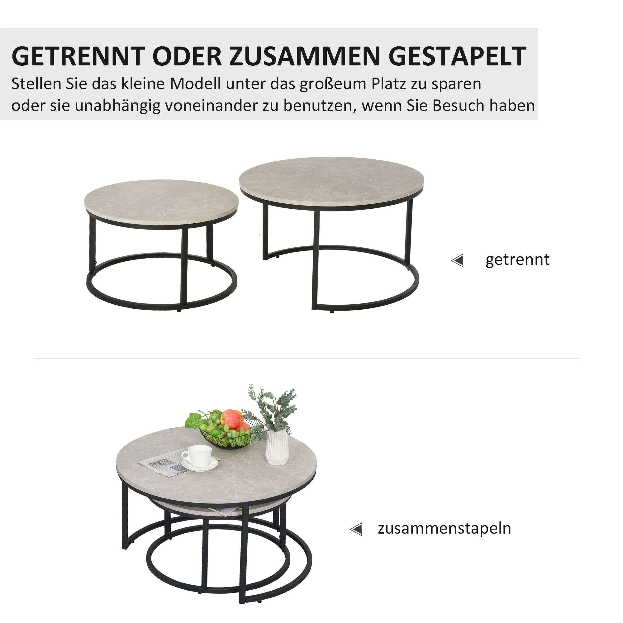 - 2er-Set Couchtische mit zementgrauer Tischplatte und schwarzem Metallgestell