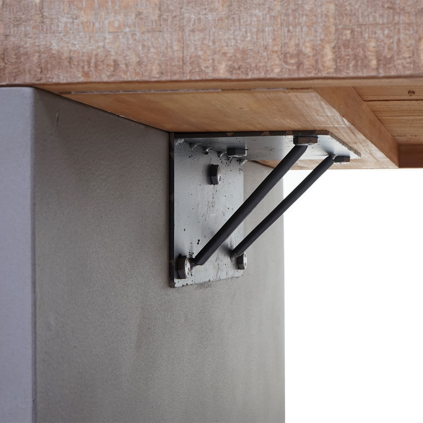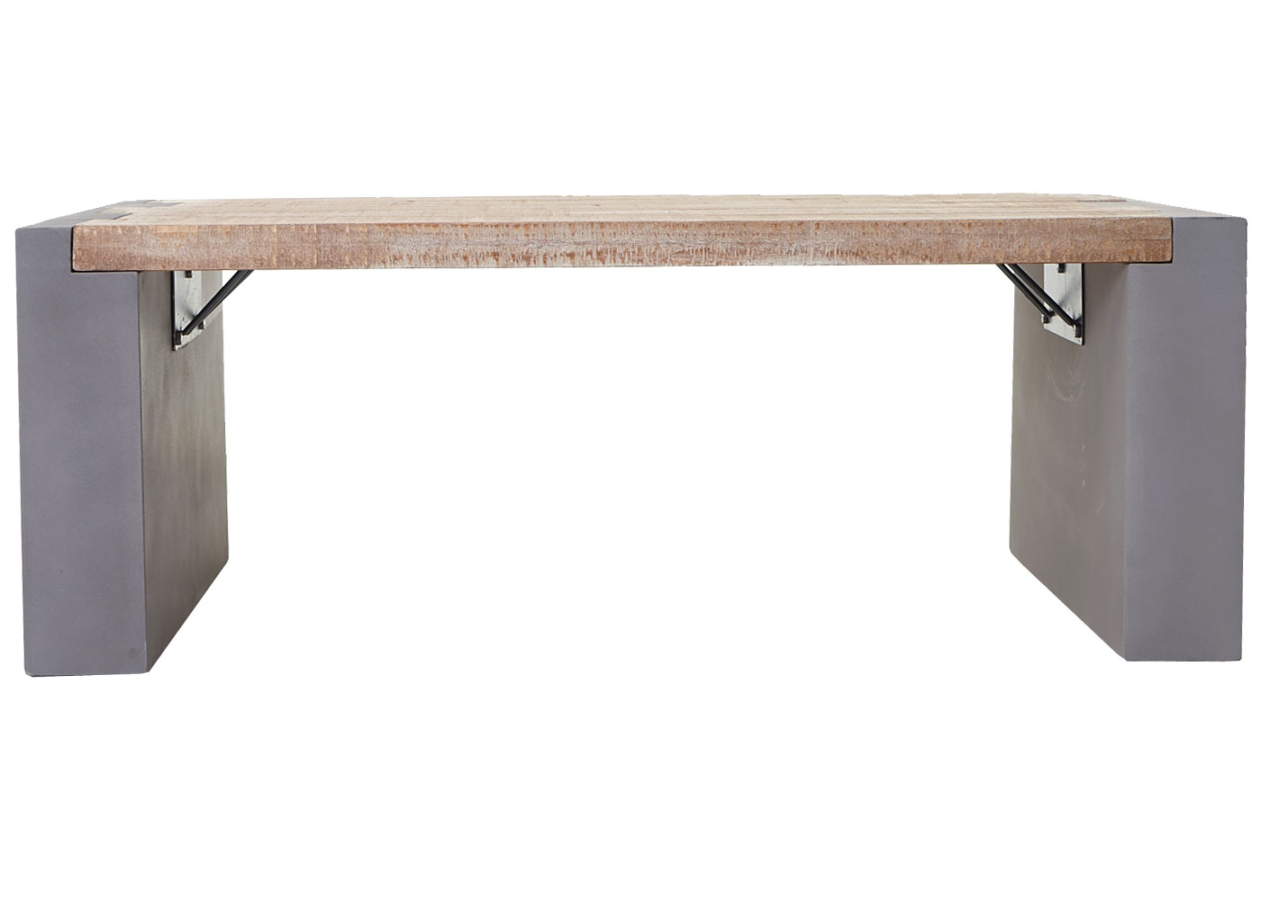 Ein klares Design kombiniert antike Elemente mit einem Vintage-Touch. Das naturbelassene Holz ist zum Schutz mit mattem Klarlack überzogen, was den rustikalen Charme betont. Diese Kombination aus Beton-Optik und Holz integriert sich mühelos in fast jede Wohnumgebung, während sie zugleich als dezenter Blickfang dient.