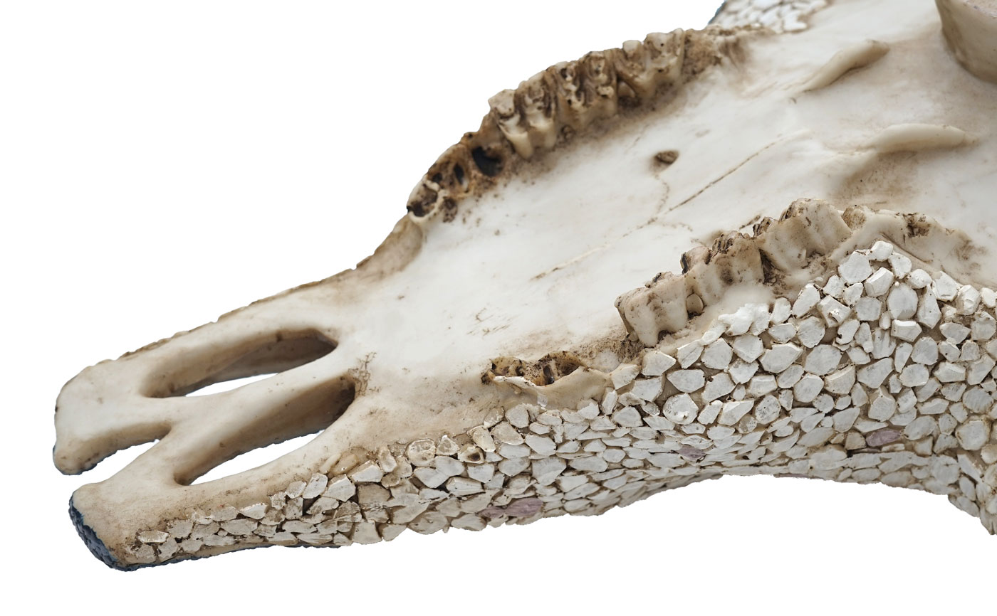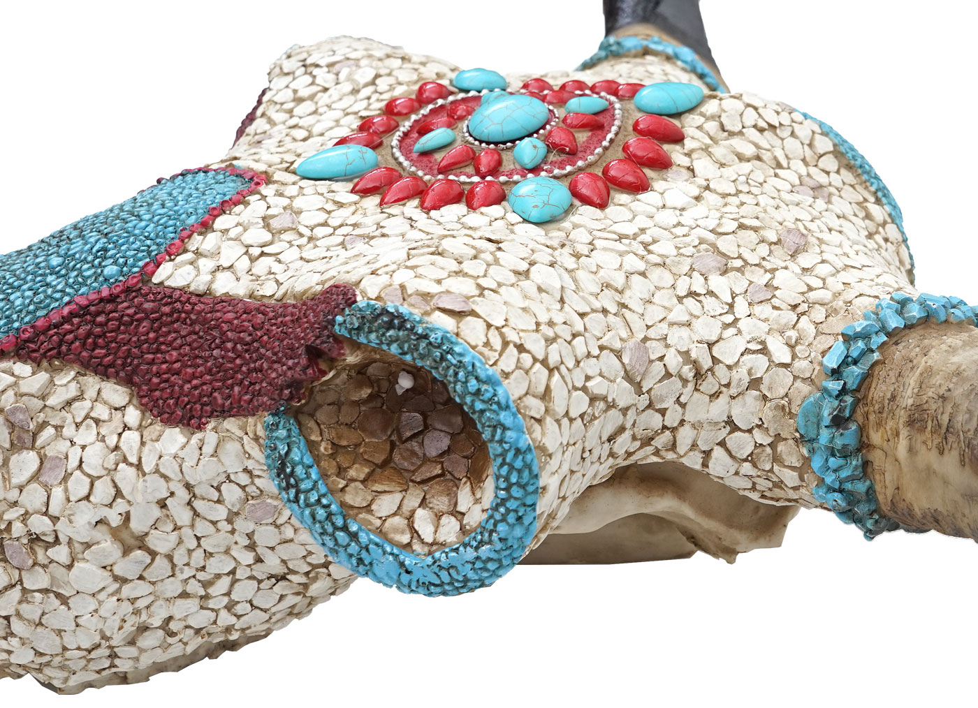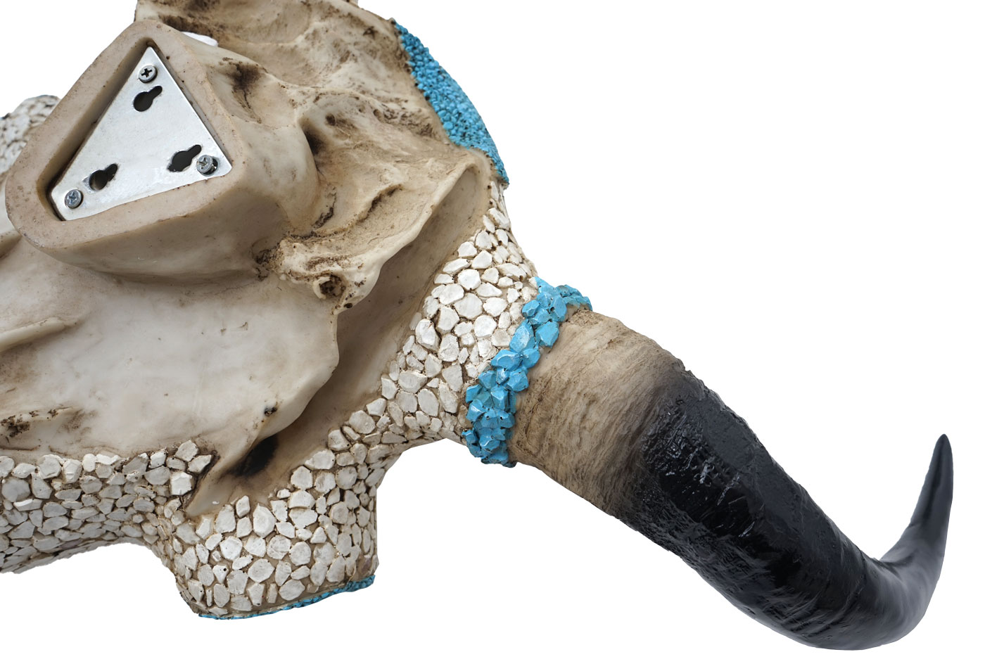 Diese Jagdtrophäe ist ein absolutes Highlight und passt in jeden Wohnraum, Wintergarten oder auch in Vereinsheime – einfach überall dort wo das Herz eines Western-Liebhabers höher schlägt. Der Schädel ist aufwendig mit Mosaik- und Ziersteinen dekoriert. Die Hörner sind bereits ein fester Bestandteil wodurch das Schmuckstück nur noch anhand von drei stabilen Schrauben an der Rückseite an die Wand befestigt werden muss.