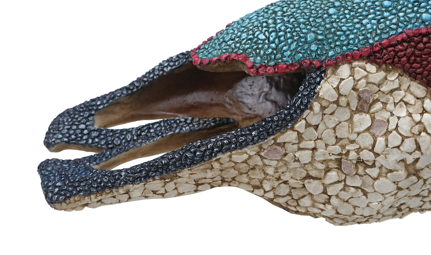 Der Schädel besteht aus sehr widerstandsfähigem Polyresin, eine besondere Art von Kunststein, der in flüssiger Form verarbeitet und zur Herstellung von Figuren, Skulpturen und Statuen verwendet wird. Gegenüber Keramik hat Polyresin den Vorteil, dass es eine höhere Bruchsicherheit aufweist, witterungsbeständig und frostbeständig bis -10°C ist.