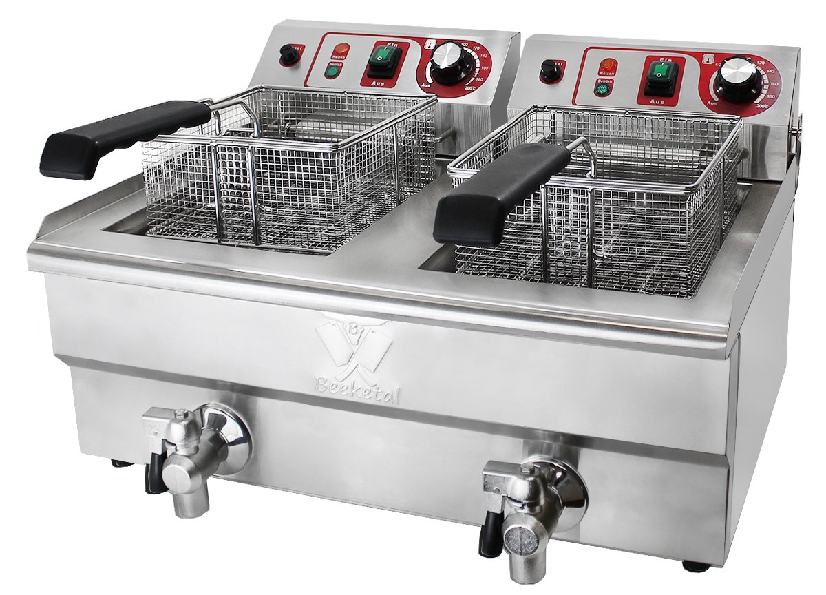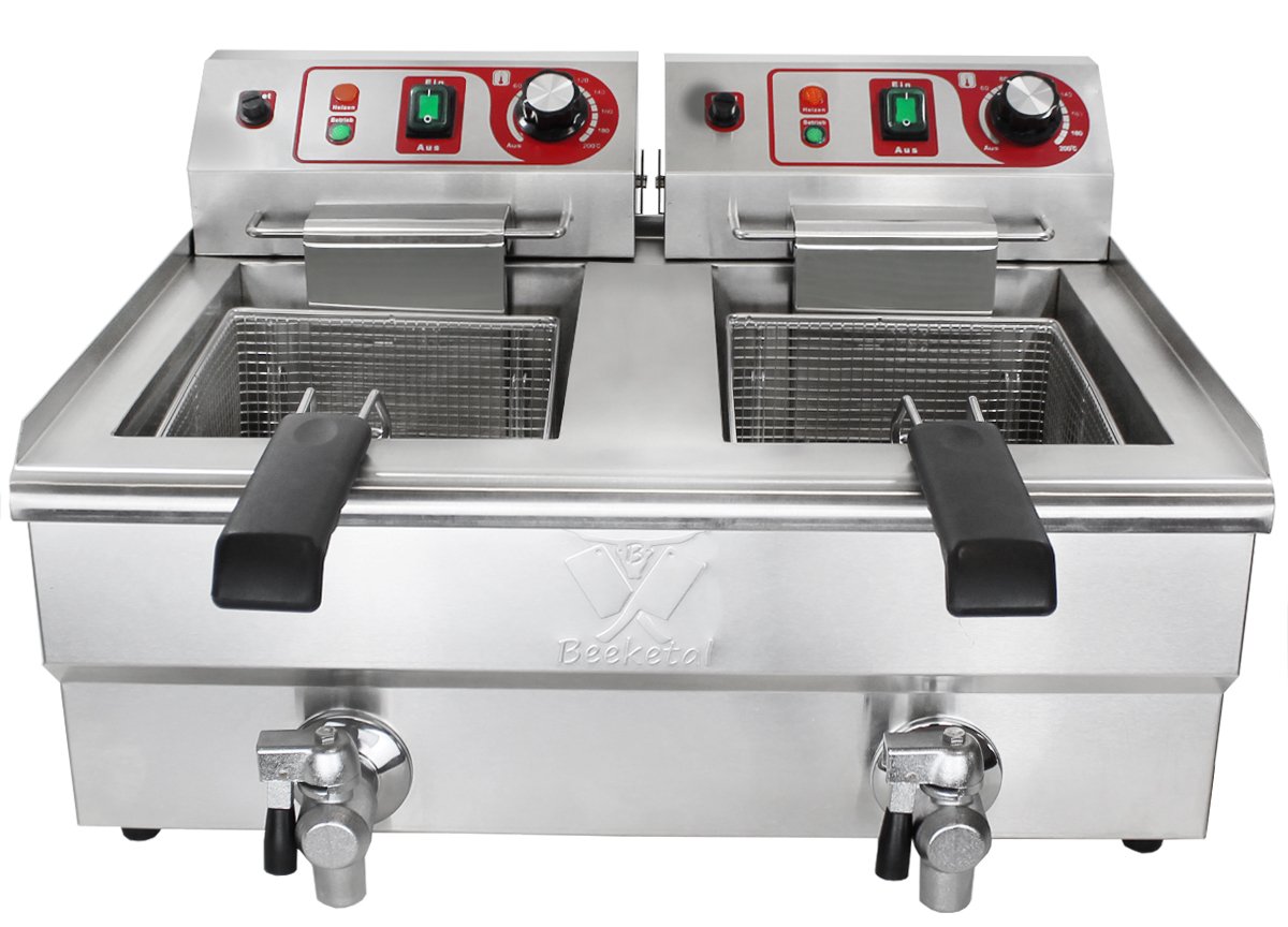 Großes Fassungsvermögen und die leichte Reinigung zeichnen die Kaltzonen Fritteusen von Beeketal aus. Ein Ablaufhahn erleichtert das Entleeren und die Reinigung der Ölwanne. Wie bei Kaltzonen Friteusen üblich, liegt die Heizspirale direkt im Ölbehälter, kann aber für die Reinigung mit samt der Bedieneinheit entweder herausgeklappt oder gleich ganz herausgenommen werden. Die sehr kurze Aufheizzeit durch die starken 2 x 3000 Watt und die stufenlos regelbare Temperatur bis 200°C machen die Beeketal Edelstahl Fritteusen perfekt für die anspruchsvolle Profi Gastronomie. Selbstredend verfügen alle Beeketal Fritteusen über eine automatische Temperaturkontrolle