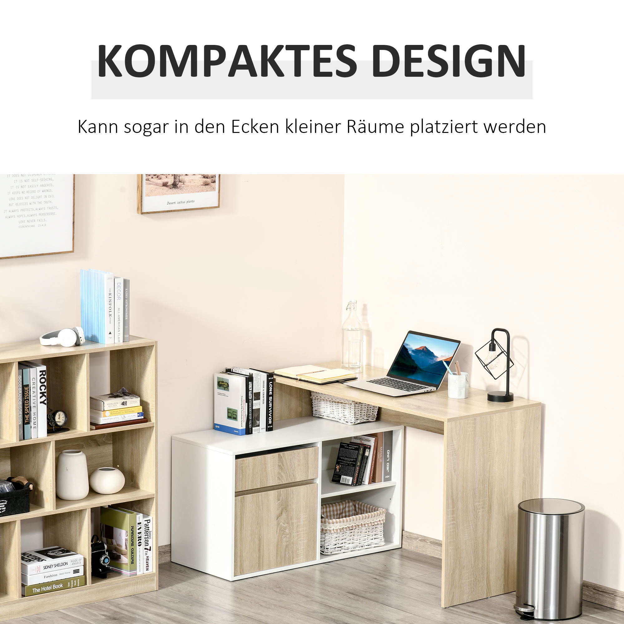 • Dieser Eckschreibtisch verfügt über einen Schrank, eine Schublade und zwei Regale