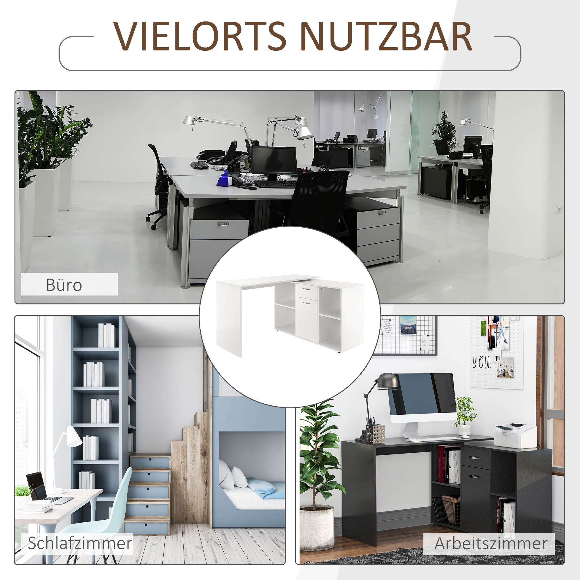Der Dual-Use-Computertisch von HOMCOM ist individuell zusammensetzbar, so dass Sie ihn je nach Wunsch als L-förmigen Eckschreibtisch oder als Schreibtisch mit flacher Wand verwenden können. Der geräumige Schrank neben dem Tisch bietet in der Schiebeschublade und im unteren Schrank mit Tür ausreichend Platz zum Verstauen Ihrer persönlichen Gegenstände. Eine stilvolle und funktionelle Ergänzung für Ihr Arbeitszimmer, Büro, Schlafzimmer, Wohnzimmer und mehr.