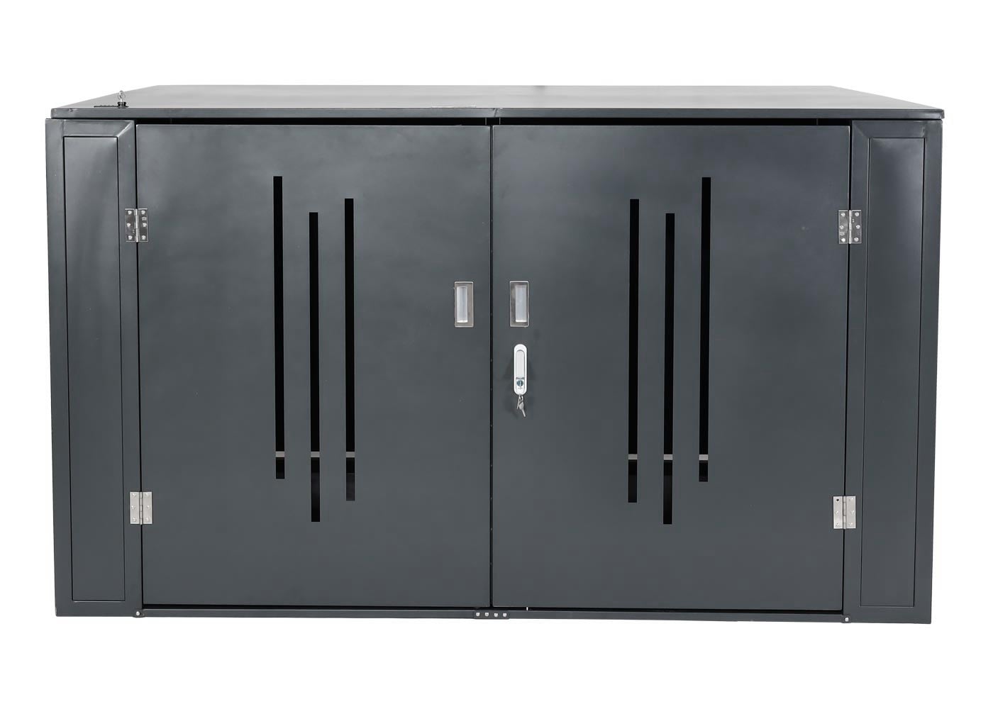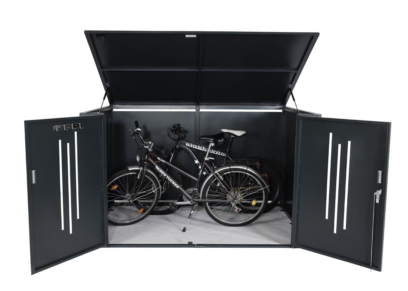 Mit dieser geräumigen Fahrradgarage bieten Sie bis zu vier Fahrrädern den optimalen Schutz vor Diebstahl. Vandalismus und Witterung. Die Fahrradbox eignet sich ideal für den Garten. das Grundstück oder die Garage und kann auch als praktischer Gartenschrank oder Geräteschrank genutzt werden.