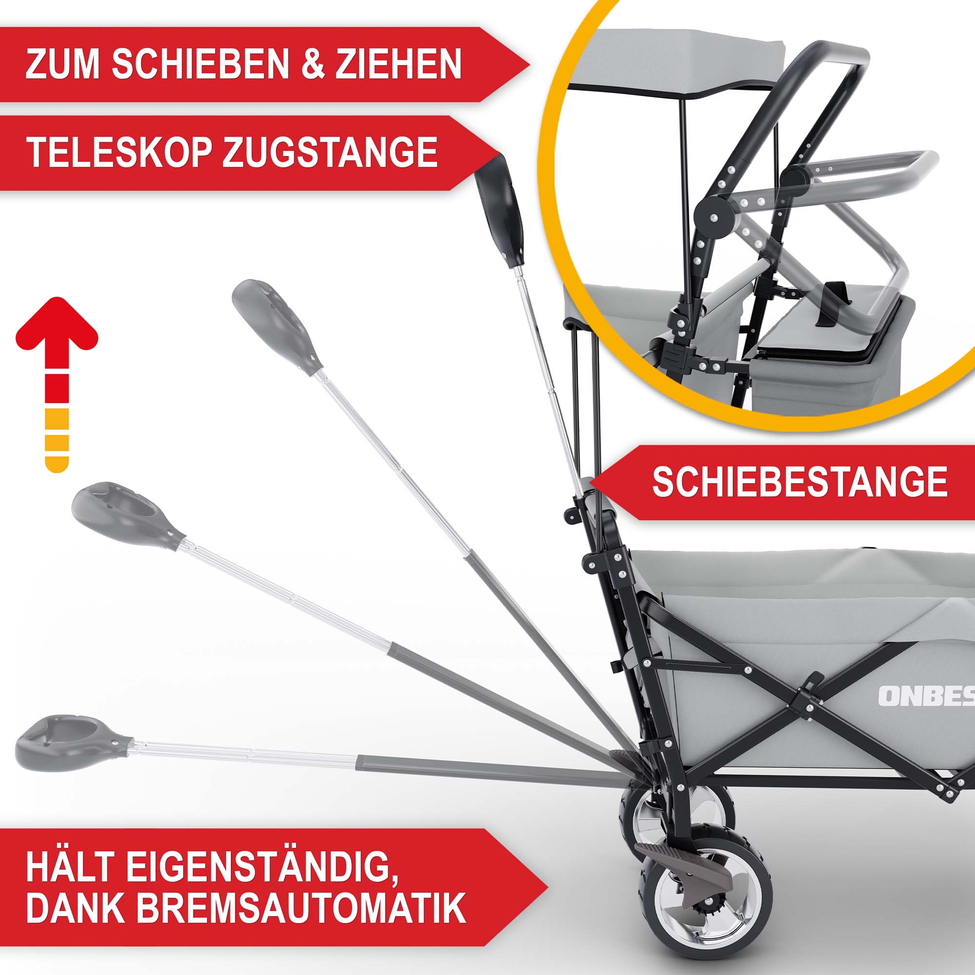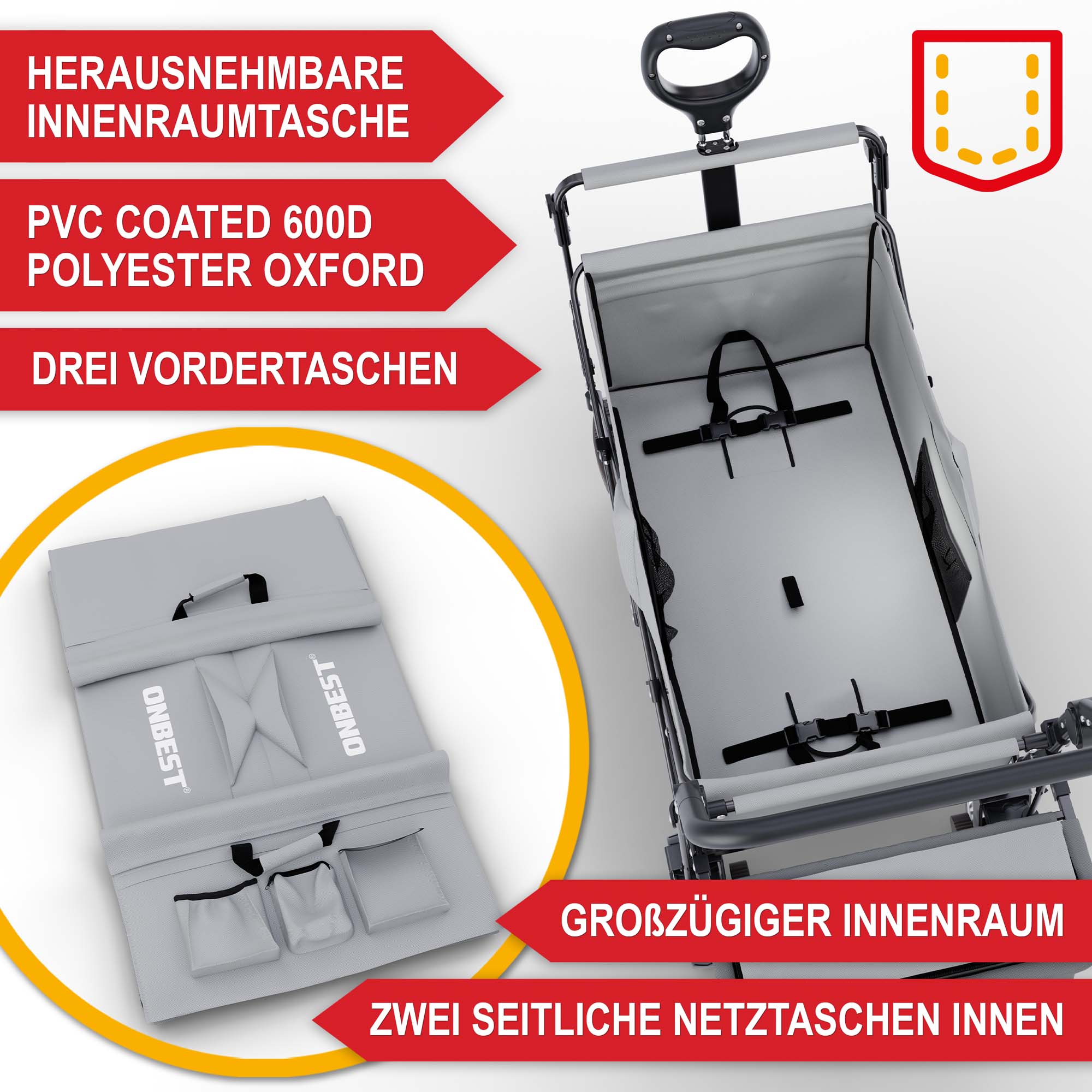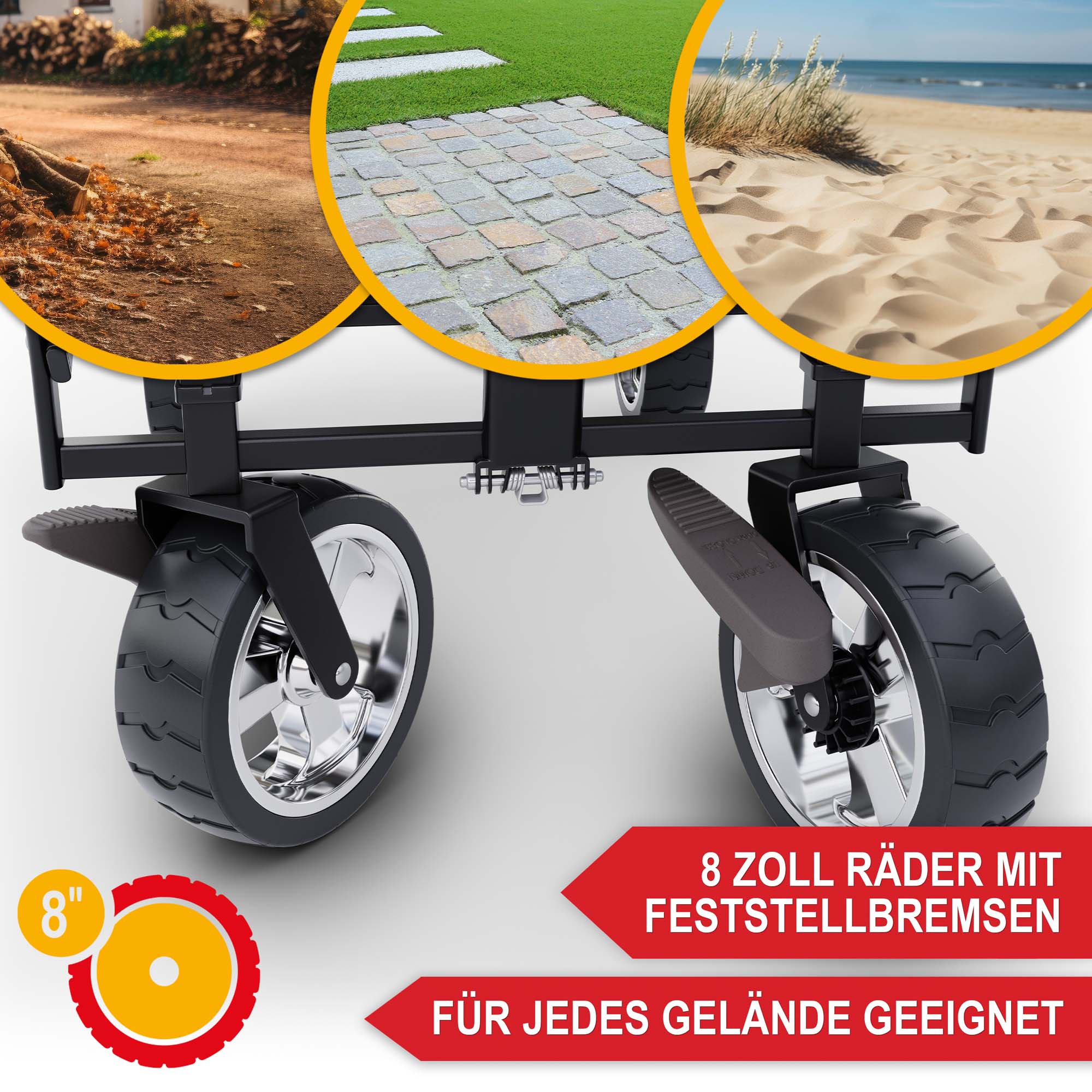 Dieser faltbare Bollerwagen bietet Komfort, Stabilität & Flexibilität – der perfekte Begleiter für Familienausflüge, Freizeitaktivitäten & Transportaufgaben.