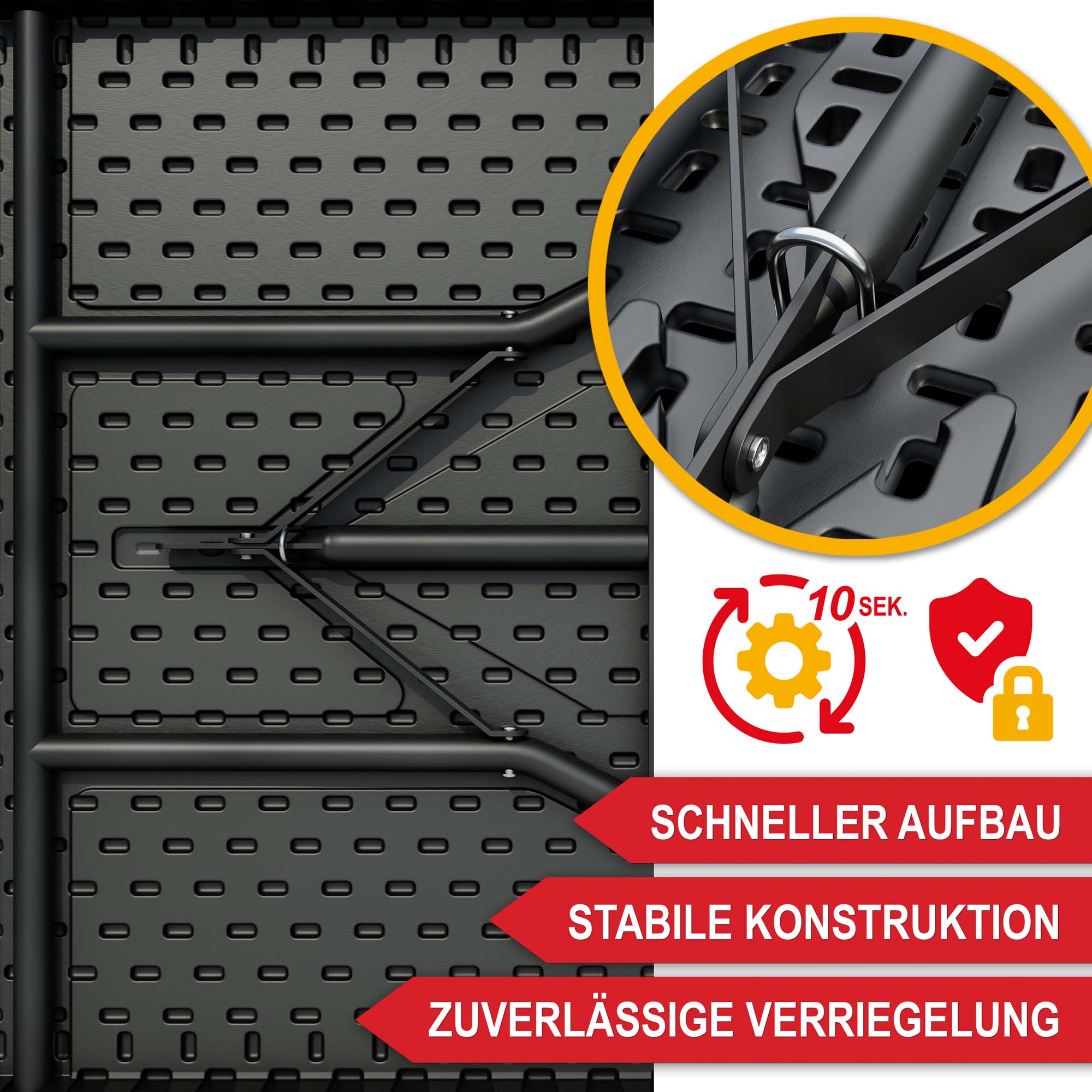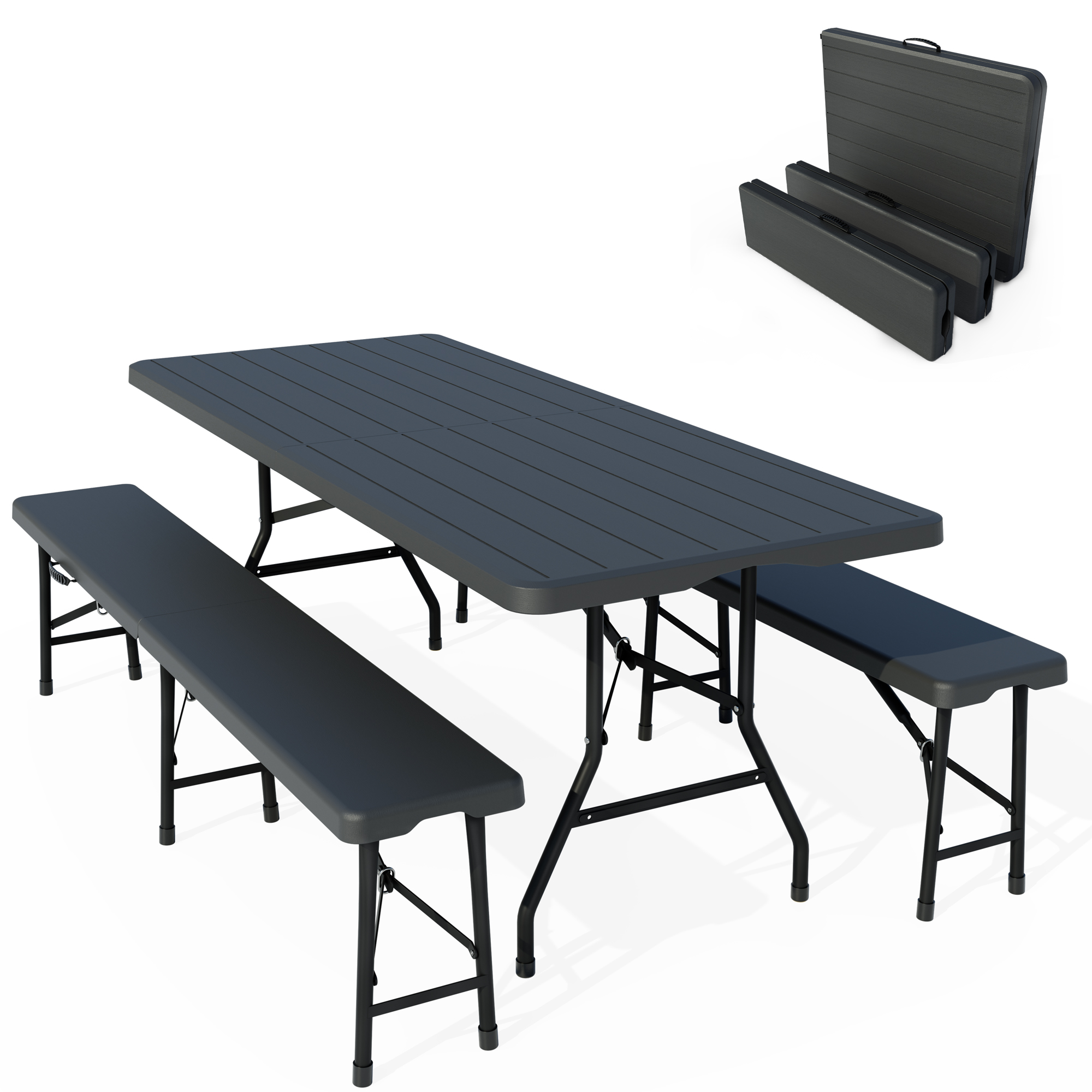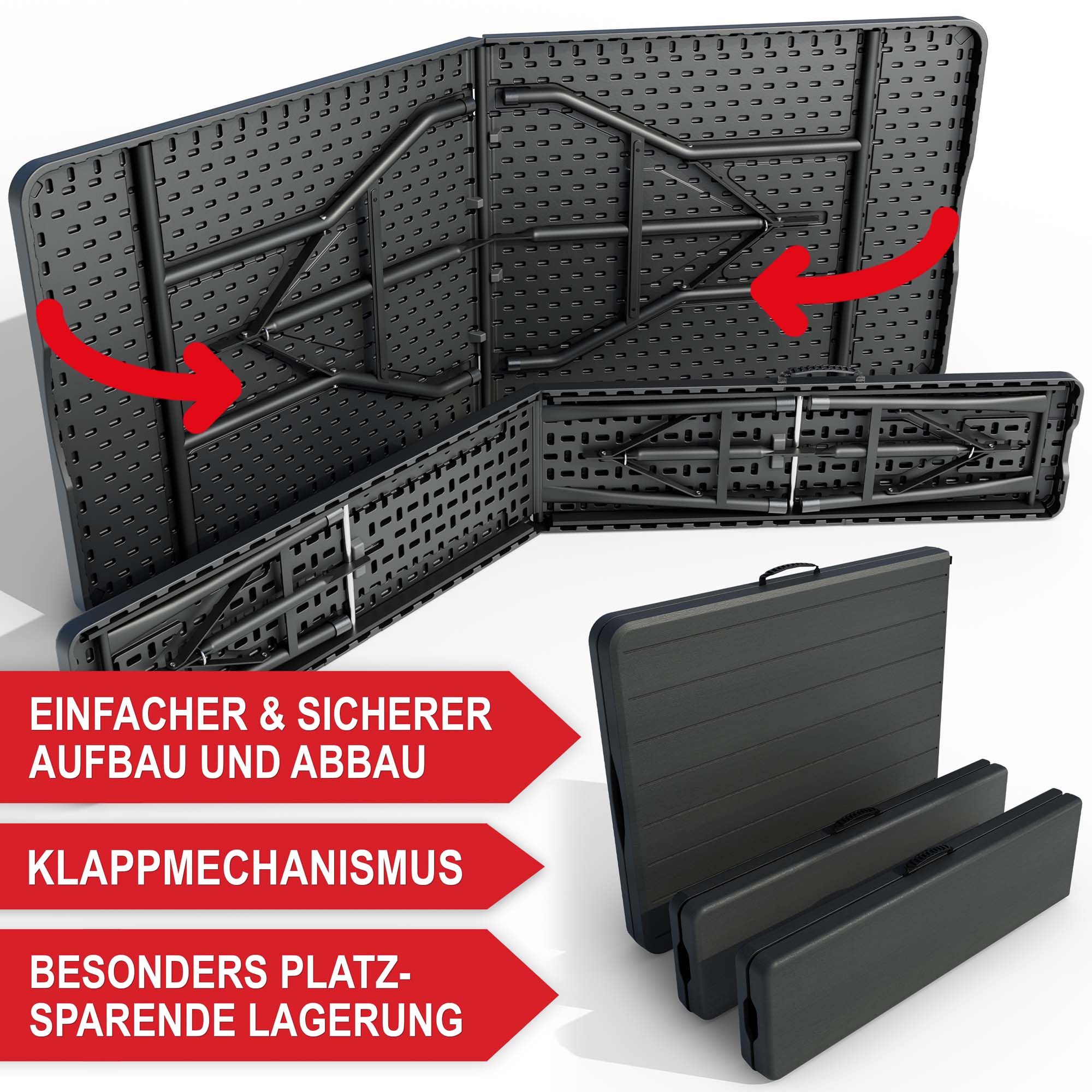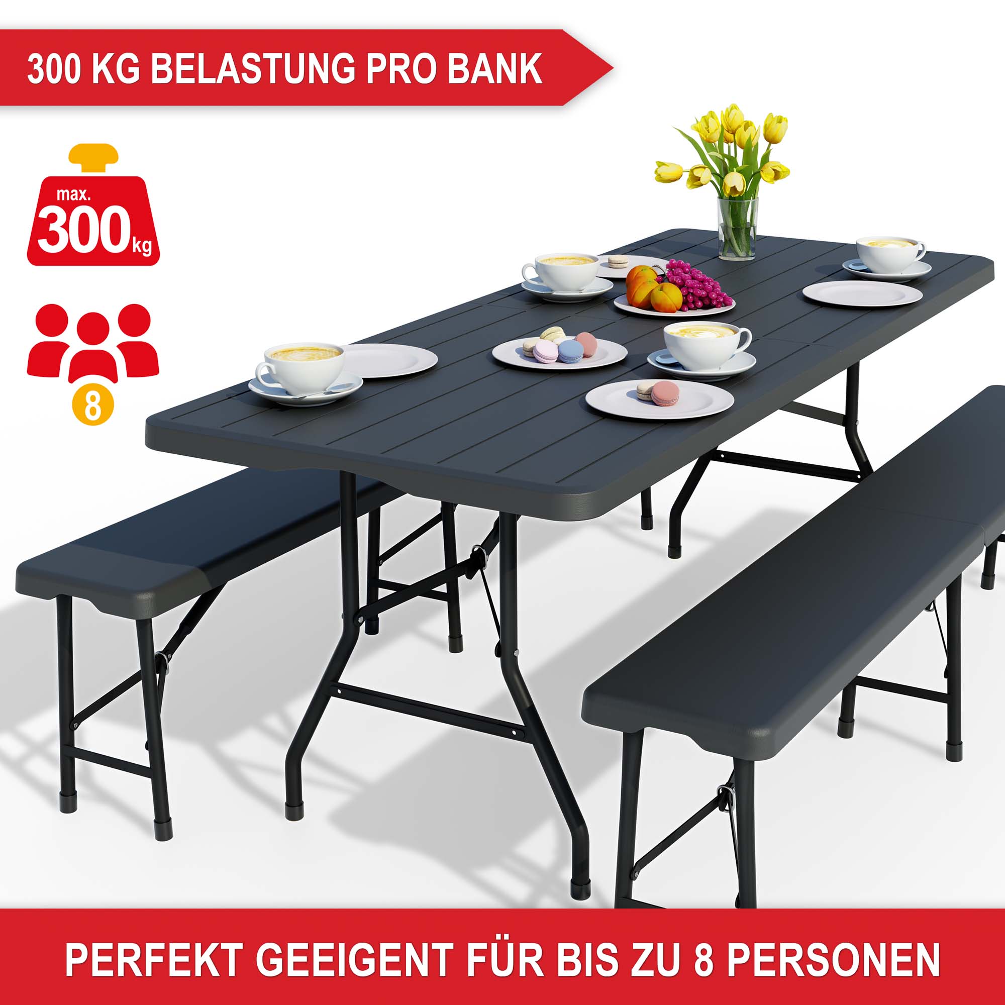 Elegante Bierbankgarnitur mit wetterfester Kunststoff-Oberfläche in Holzoptik. Klappbar & leicht zu transportieren – ideal für Outdoor-Events.