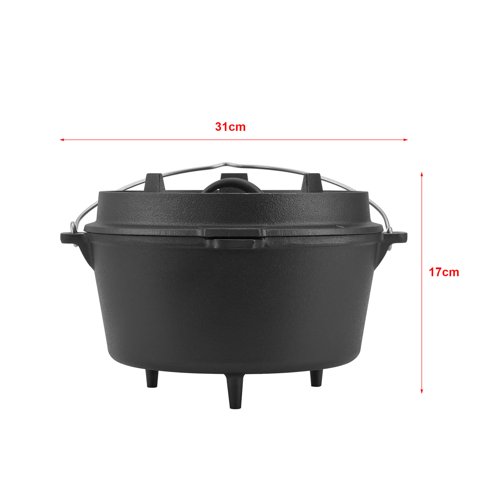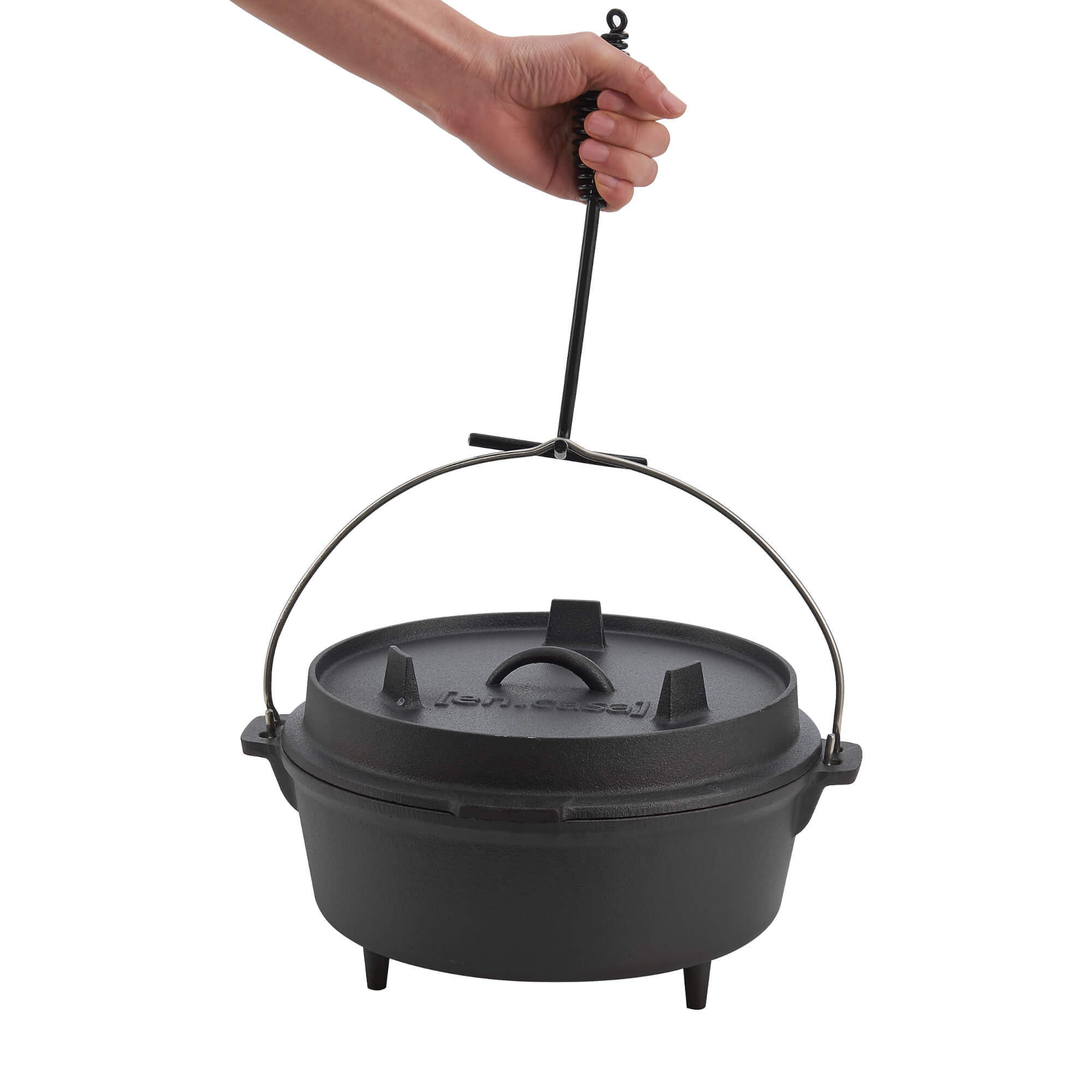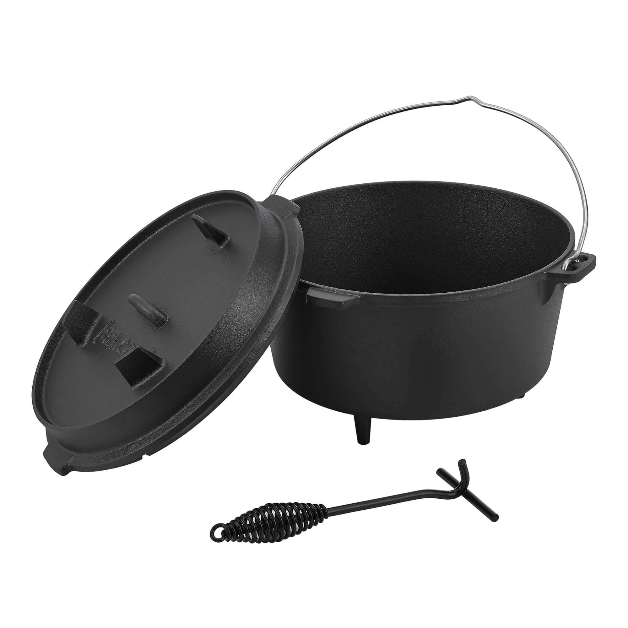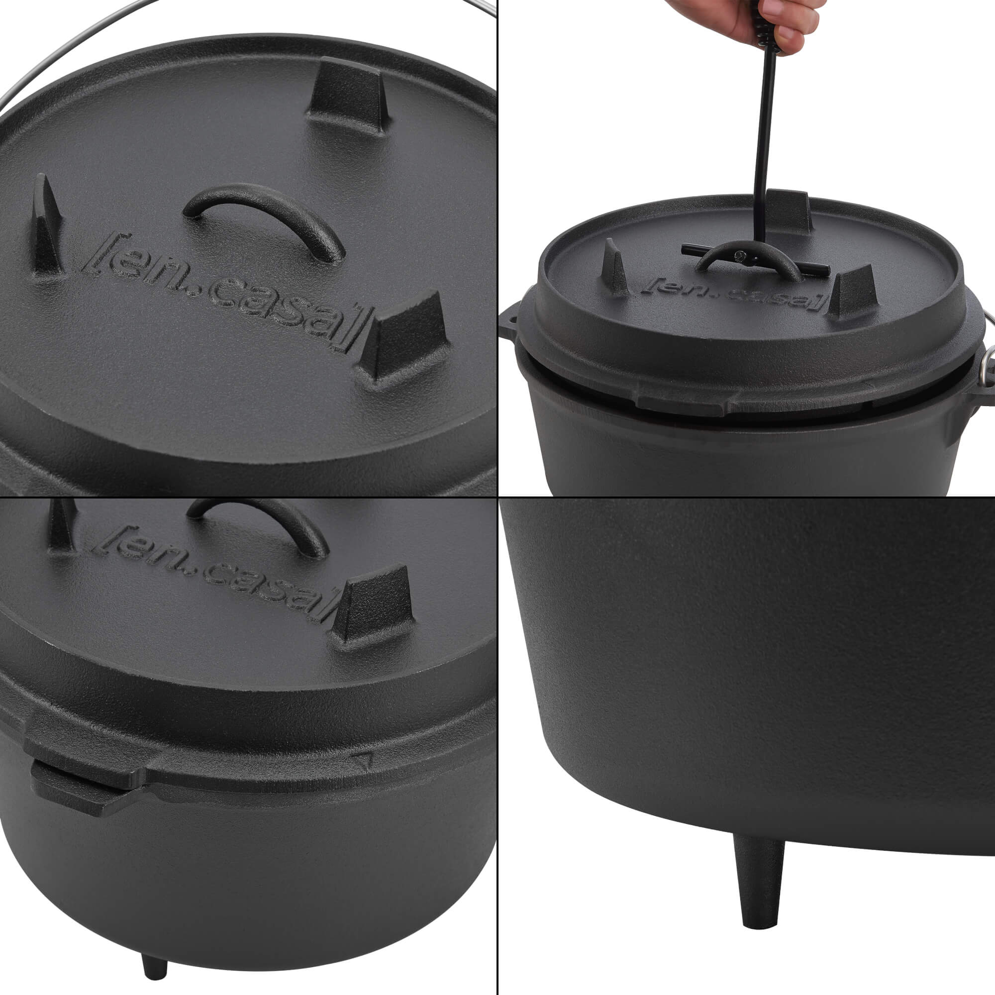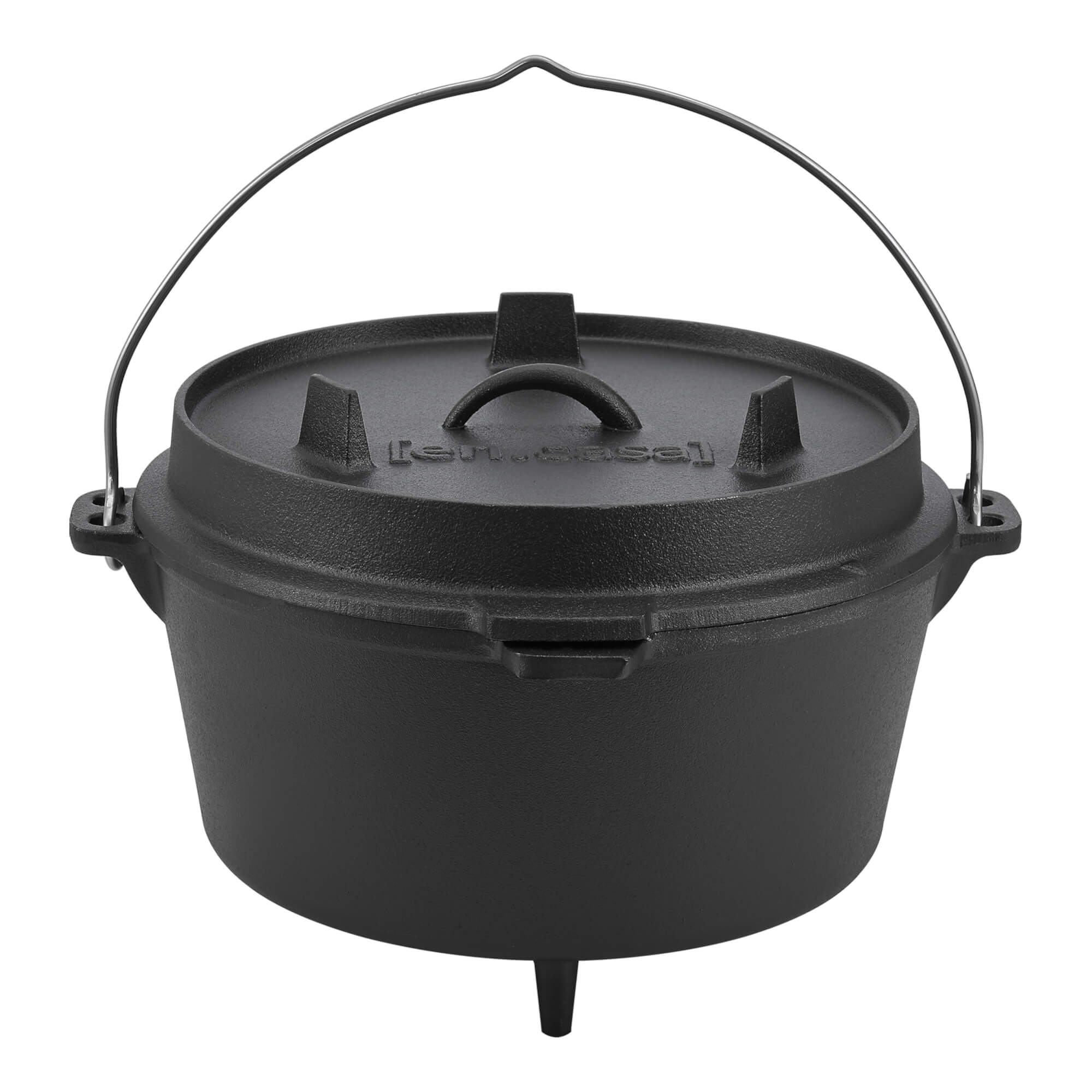 Der Kochtopf aus Gusseisen ist ein Multifunktionstalent und lässt sich bspw. als Schmortopf, Gulaschkessel oder Brotbacktopf verwenden. Glut, glühende Kohlen oder Grillbriketts können direkt auf dem Deckel oder unter dem Topf platziert werden. Der Dutch Oven ermöglicht ein gleichmäßiges Garen und verfügt darüber hinaus über einen Deckelheber.