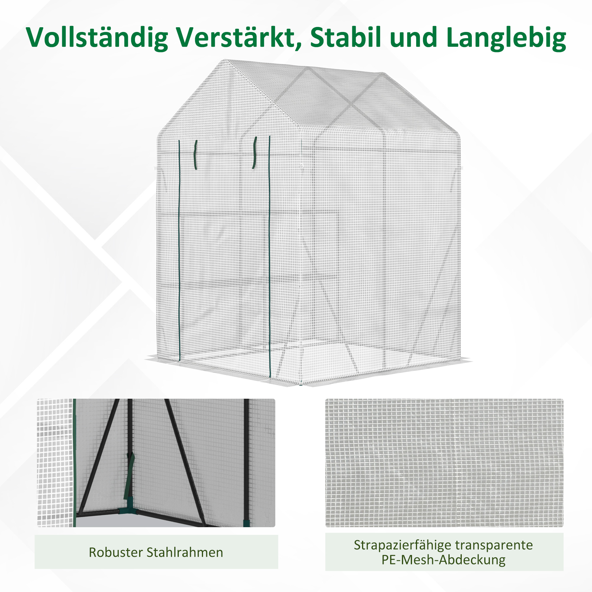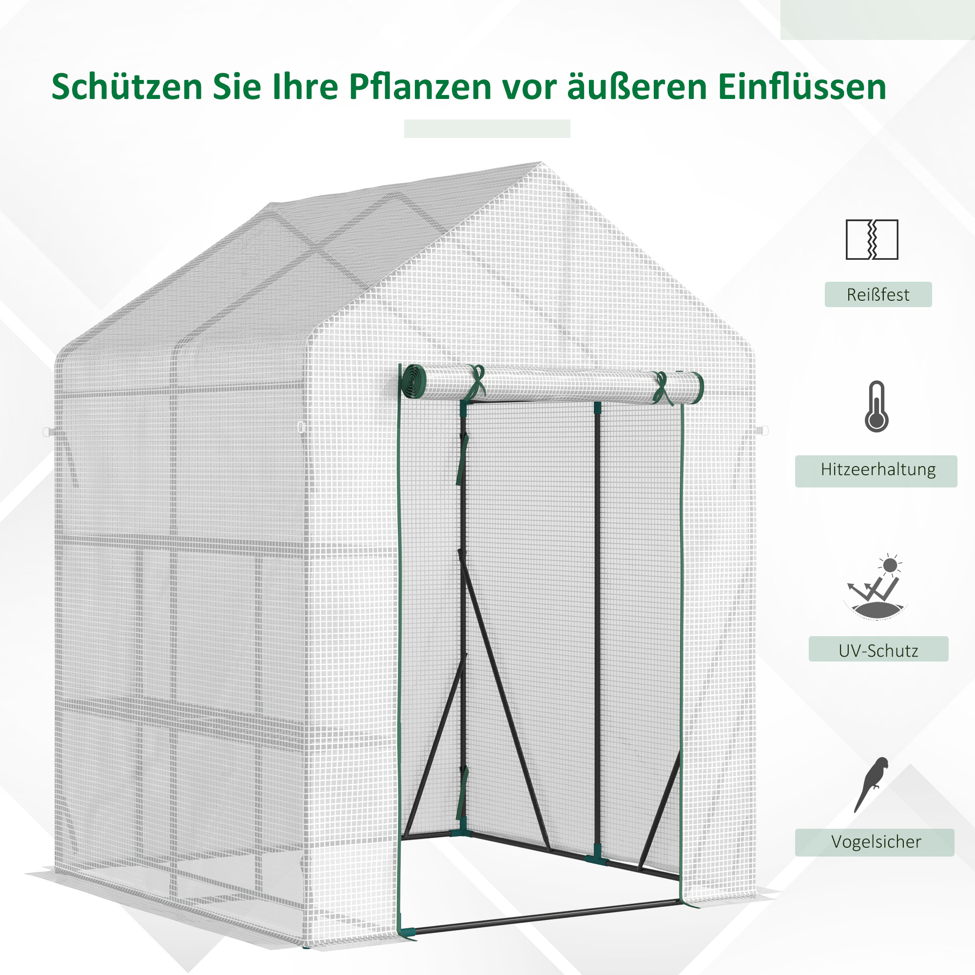 Geben Sie Ihren Lieblingsgewächsen mit diesem Gewächshaus einen sicheren Raum zum Wachsen und Gedeihen! Es verfügt über einen stabilen Stahlrahmen und einer aufrollbaren Eingangstür, um den Zugang zu Ihren Pflanzen zu erleichtern. Die robuste Kunststoffabdeckung schützt Ihre Pflanzen vor Kälte und Vögeln und lässt energiereiches Sonnenlicht hindurch. Das Gewächshaus ist in nur wenigen Handgriffen aufgestellt, sodass Sie sofort Ihrem Lieblingshobby nachgehen können!