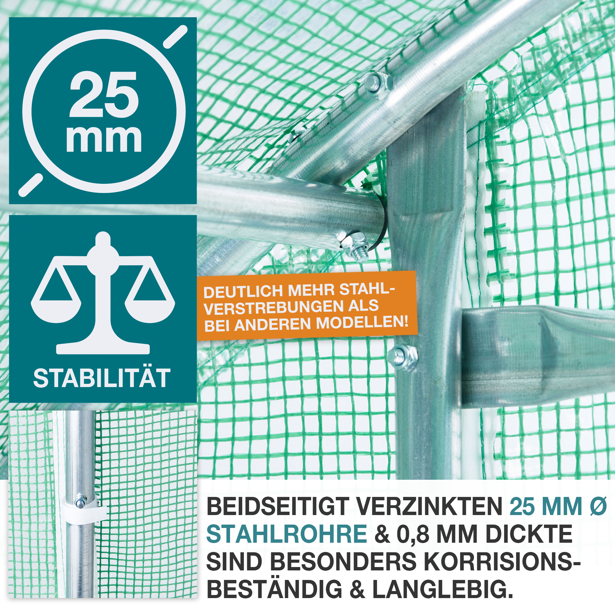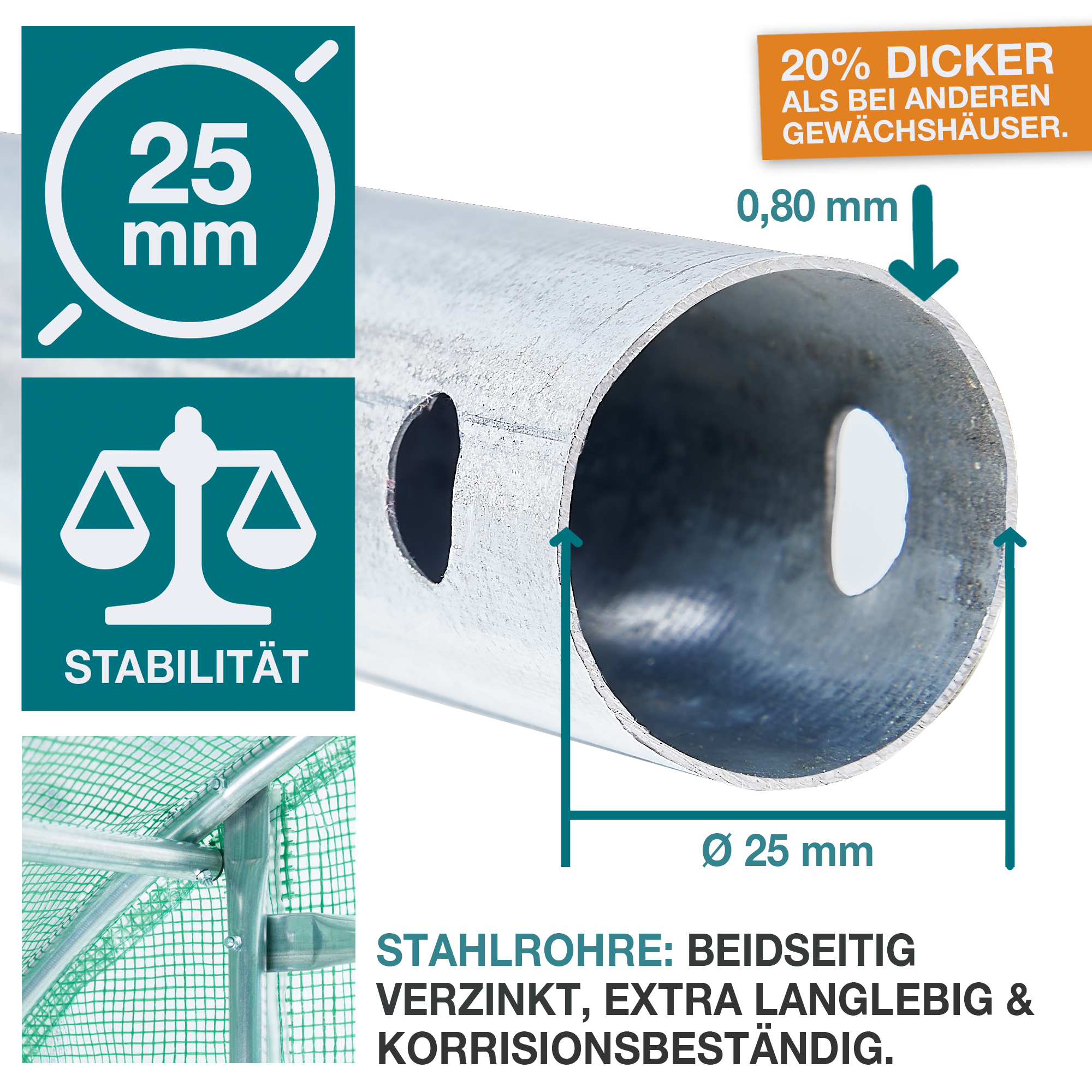 • Verzinkte Stahlrohre (Ø 25 mm, 0,8 mm Wandstärke) – rostfrei und langlebig