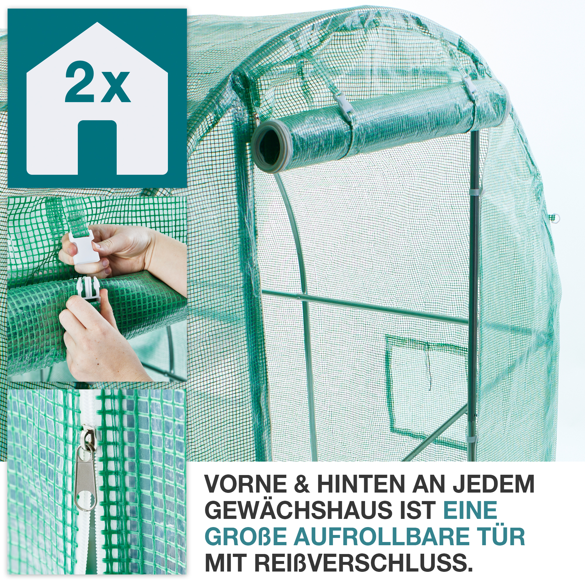 • Front- und Rücktür mit Reißverschluss, aufrollbar und fixierbar