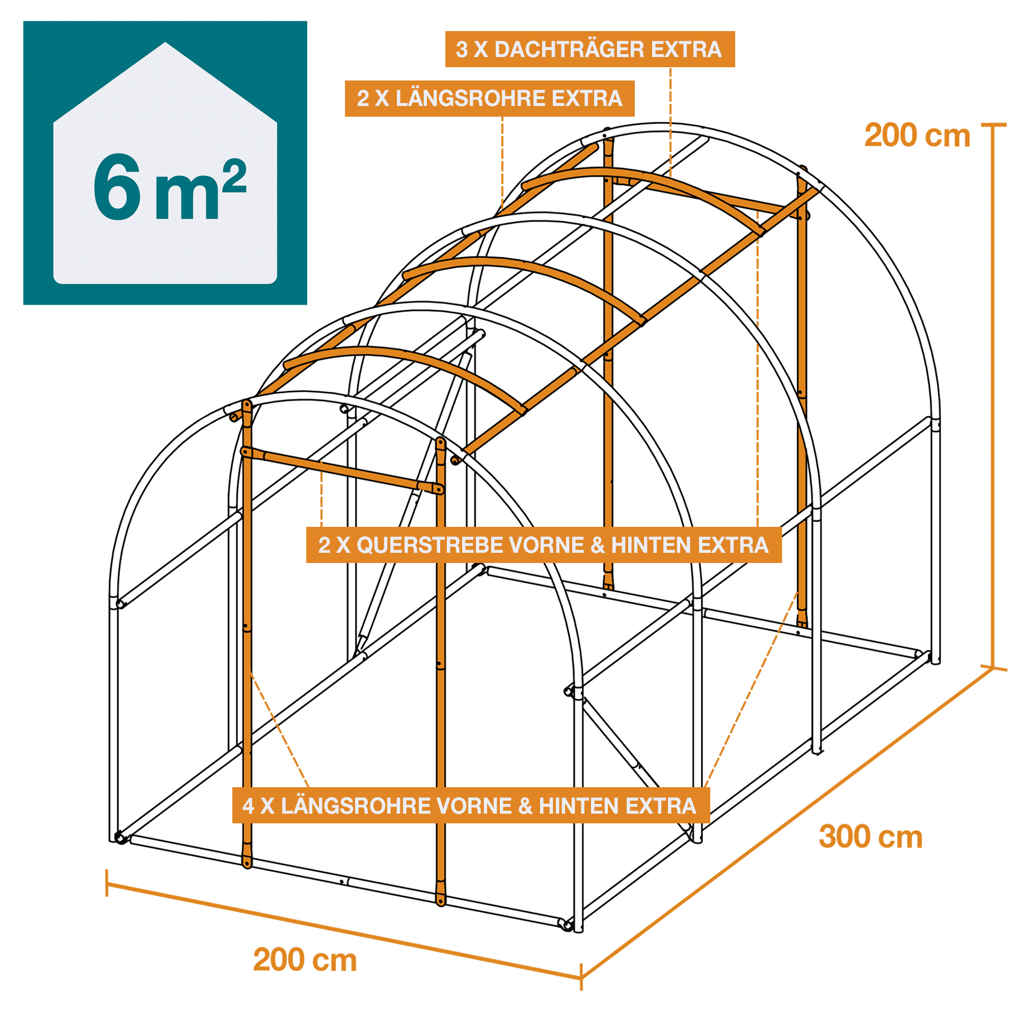 • Größe L – 6 m²: 200 x 200 x 300 cm (B x H x T)