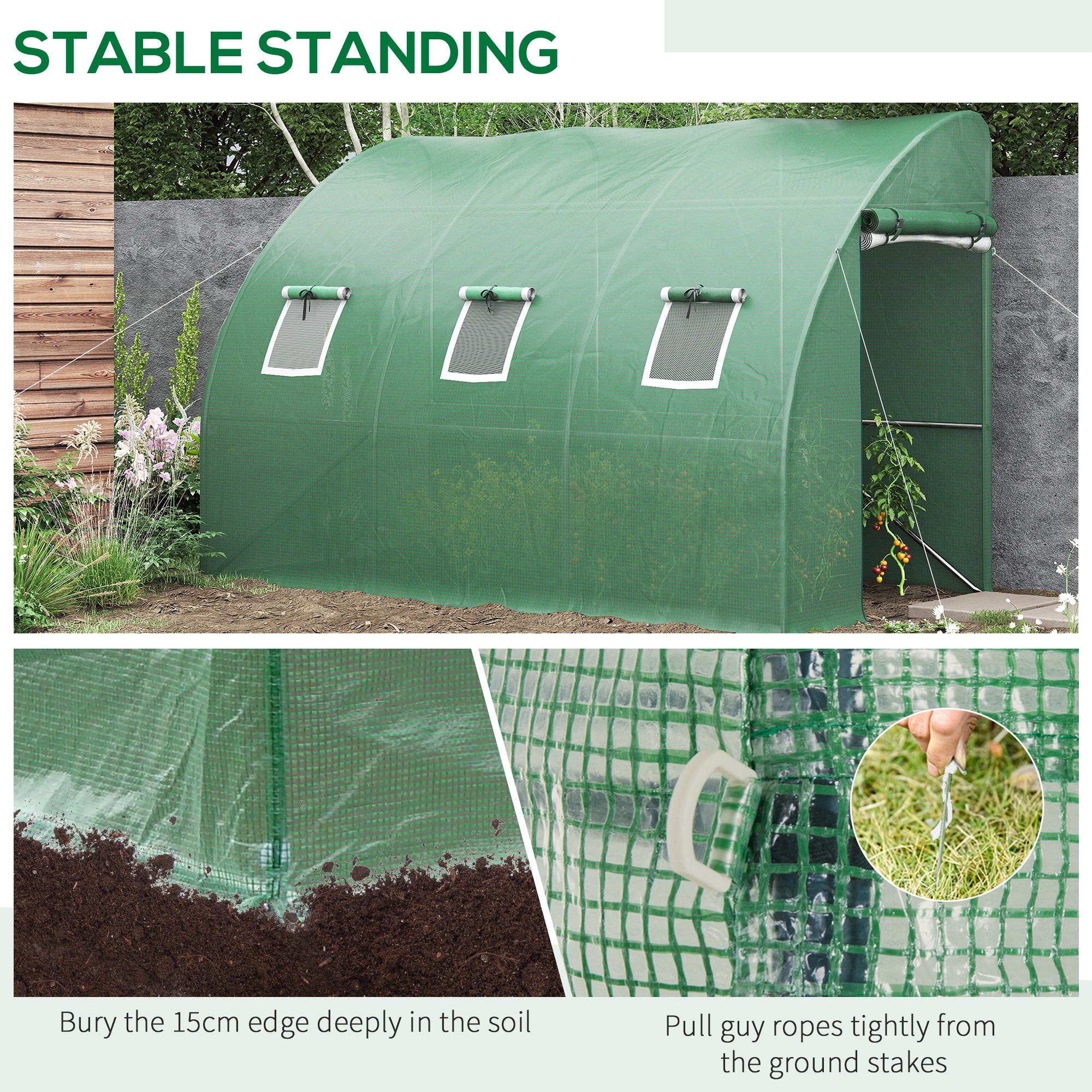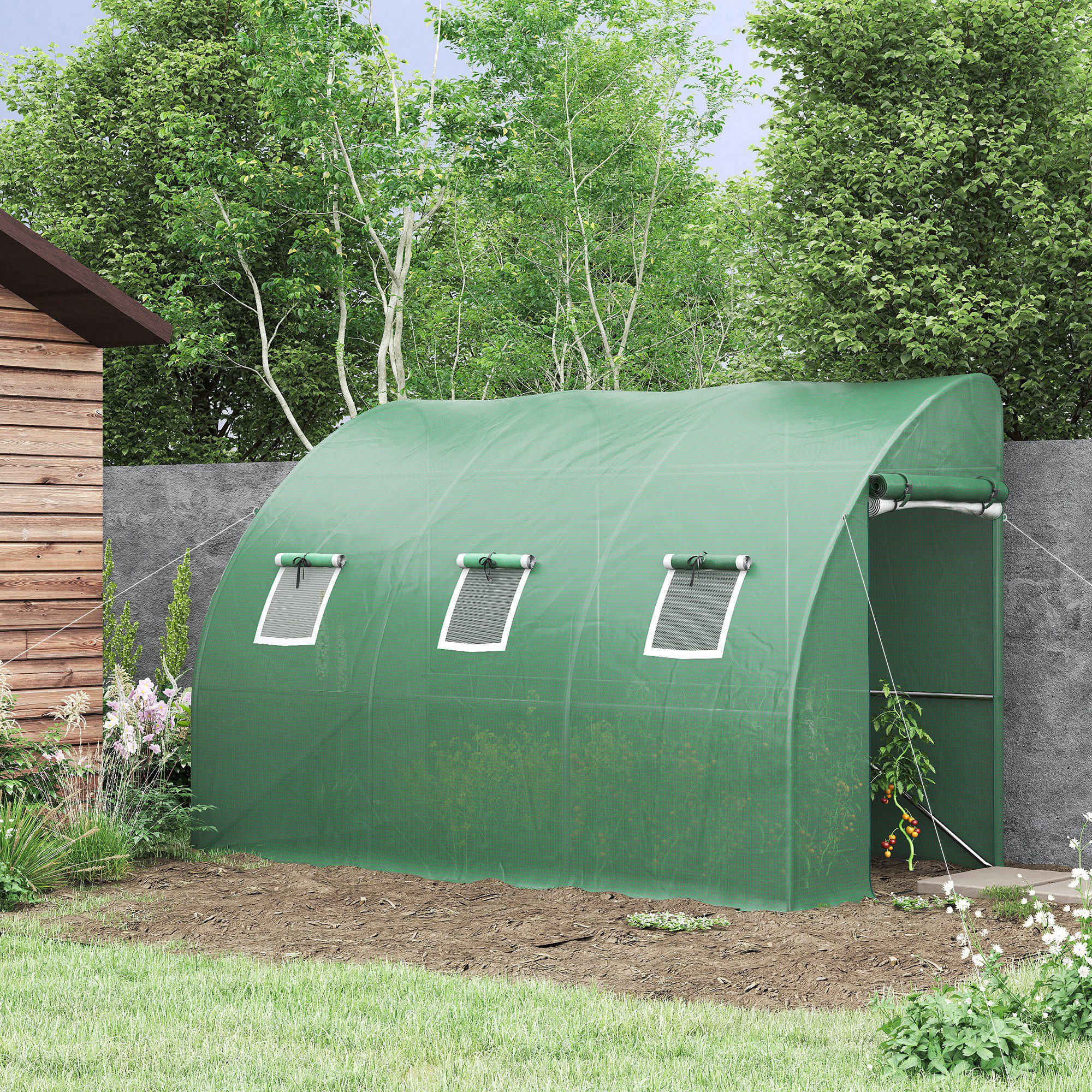 Verlängern Sie Ihre Anbausaison und schützen Sie Ihre Pflanzen vor Kälte und Frost, mit dem Gewächshaus. Dieses Anlehngewächshaus wird an der Seite Ihres Hauses, Ihrer Garage, Ihrer Scheune oder Ihres Schuppens angebracht, was einen sicheren Stand und zusätzliche Stabilität gewährleistet. Dank der aufrollbaren Türen und Fenster können Sie die Temperatur, die Feuchtigkeit und die Sonneneinstrahlung regulieren. Die Kunststoffabdeckung des Gewächshauses schützt ihre Pflanzen vor UV-Strahlen, lässt aber ausreichend Sonnenlicht hinein. Genießen Sie das ganze Jahr über frisches Gemüse, Kräuter und selbst gezüchtete Tomaten.