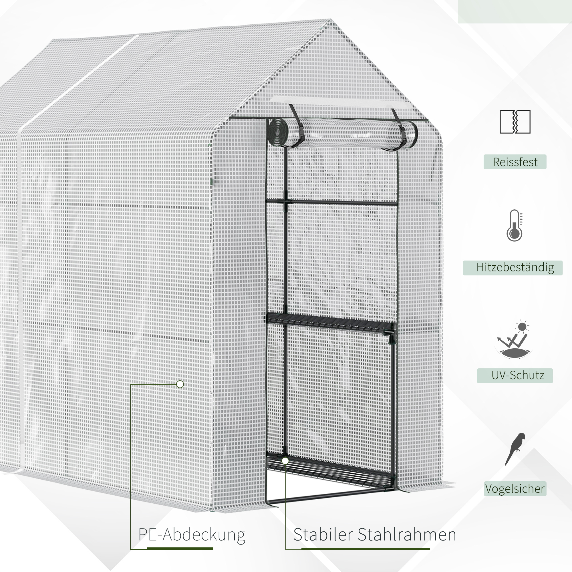 Sie suchen nach einer Möglichkeit, das ganze Jahr über Pflanzen anzubauen? Dies Gewächshaus ist die optimale Lösung. Der Stahlrahmen sorgt für einen robusten Kern und ist mit einer PE-Kunststoffabdeckung ausgestattet, die Schutz die vor Wettereinflüsse schütz. Die aufrollbare Tür gewährleistet einen einfachen Zugang. Im Inneren befinden sich vier Regale zur einfachen Aufbewahrung und Organisation.