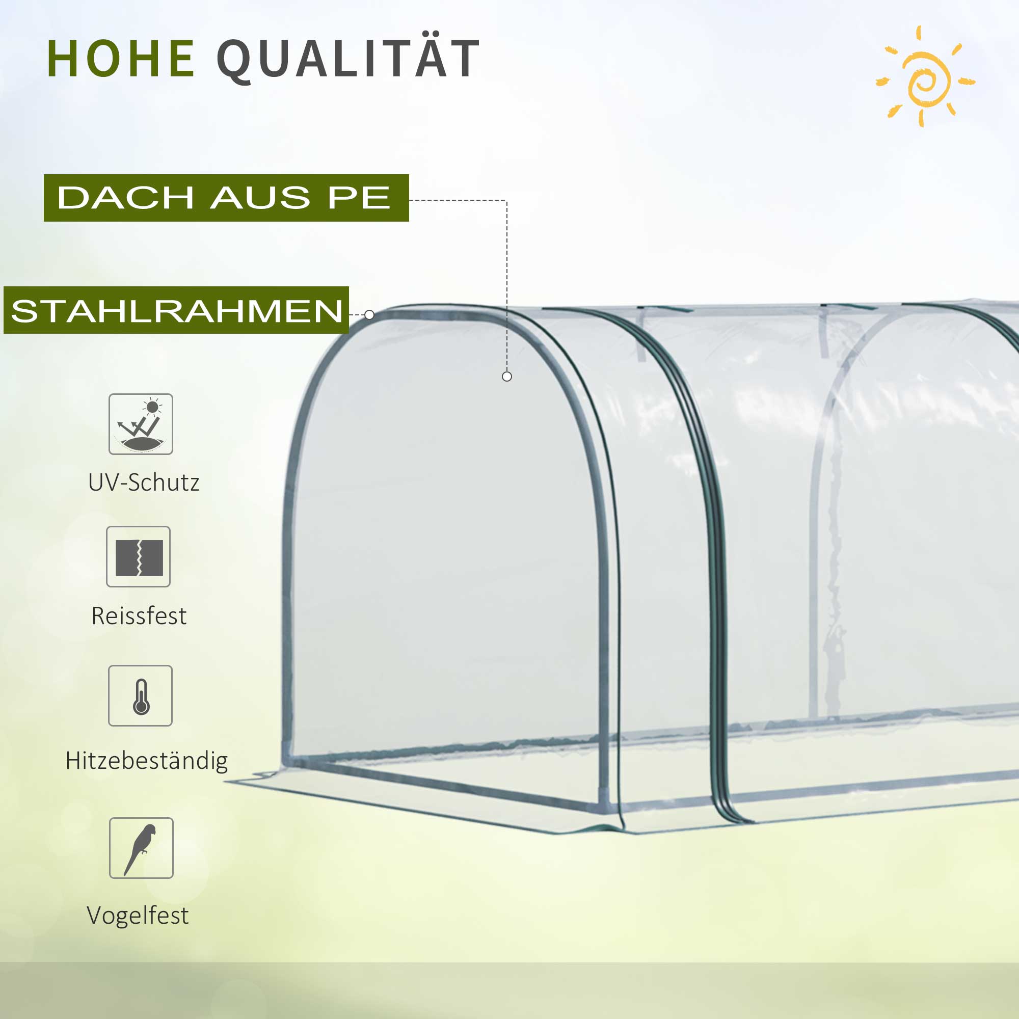 Sichern Sie sich Freude an Ihrem Garten das ganze Jahr über! Durch die aufrollbaren Türen sichert das Folienzelt Ihren Pflanzen eine angenehme Temperatur, Licht und ausreichend Feuchtigkeit. Dieses stabile Foliengewächshaus lässt sich bei Bedarf schnell und einfach aufbauen und nach der Aufzucht wieder abbauen. Ihre Pflanzen werden vor Kälte, Regen, Hagel, Wind und intensiver Sonneneinstrahlung geschützt. Dank der transparenten Folie behalten Sie Ihre Pflanzen immer gut im Blick.