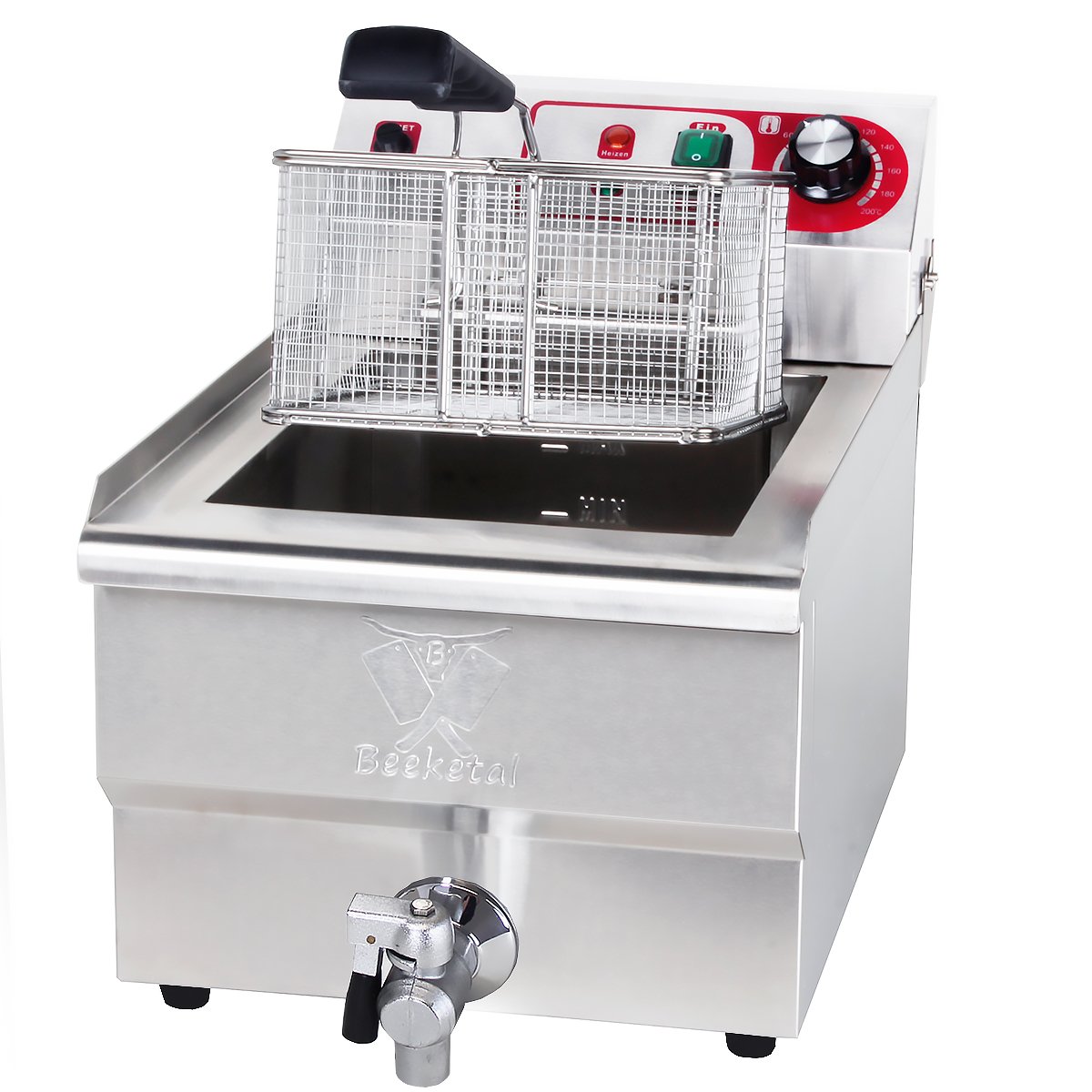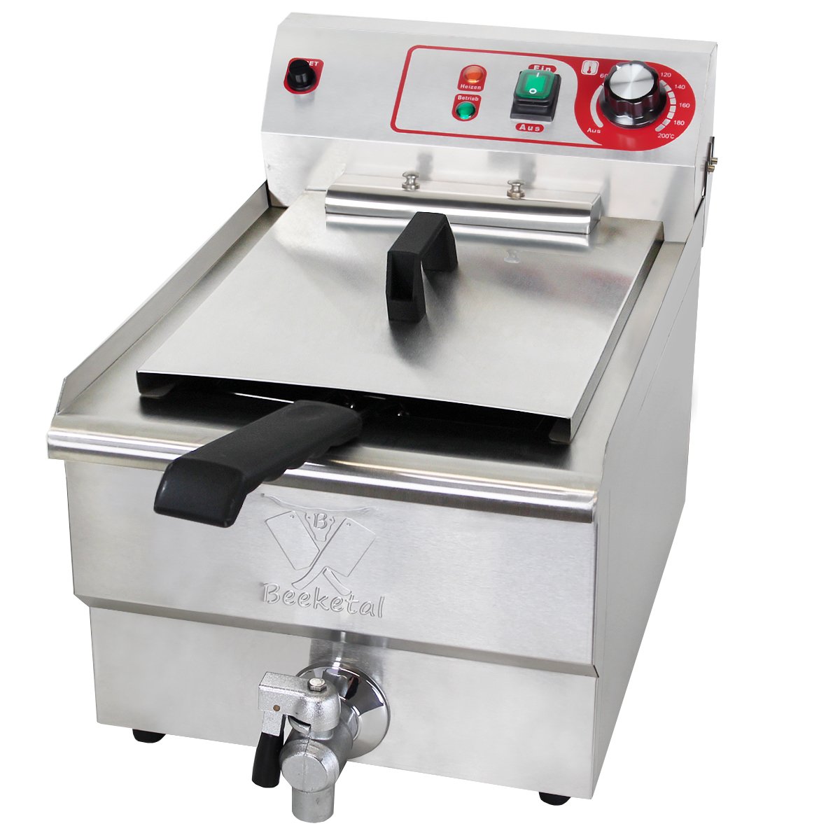Großes Fassungsvermögen und die leichte Reinigung zeichnen die Kaltzonen Fritteusen von Beeketal aus. Ein Ablaufhahn erleichtert das Entleeren und die Reinigung der Ölwanne. Wie bei Kaltzonen Fritteusen üblich, liegt die Heizspirale direkt im Ölbehälter, kann aber für die Reinigung mit samt der Bedieneinheit entweder herausgeklappt oder gleich ganz herausgenommen werden. Die sehr kurze Aufheizzeit durch die starken 5000 Watt und die stufenlos regelbare Temperatur bis 200°C machen die Beeketal Edelstahl Fritteusen perfekt für die anspruchsvolle Profi Gastronomie. Selbstredend verfügen alle Beeketal Fritteusen über eine automatische Temperaturkontrolle