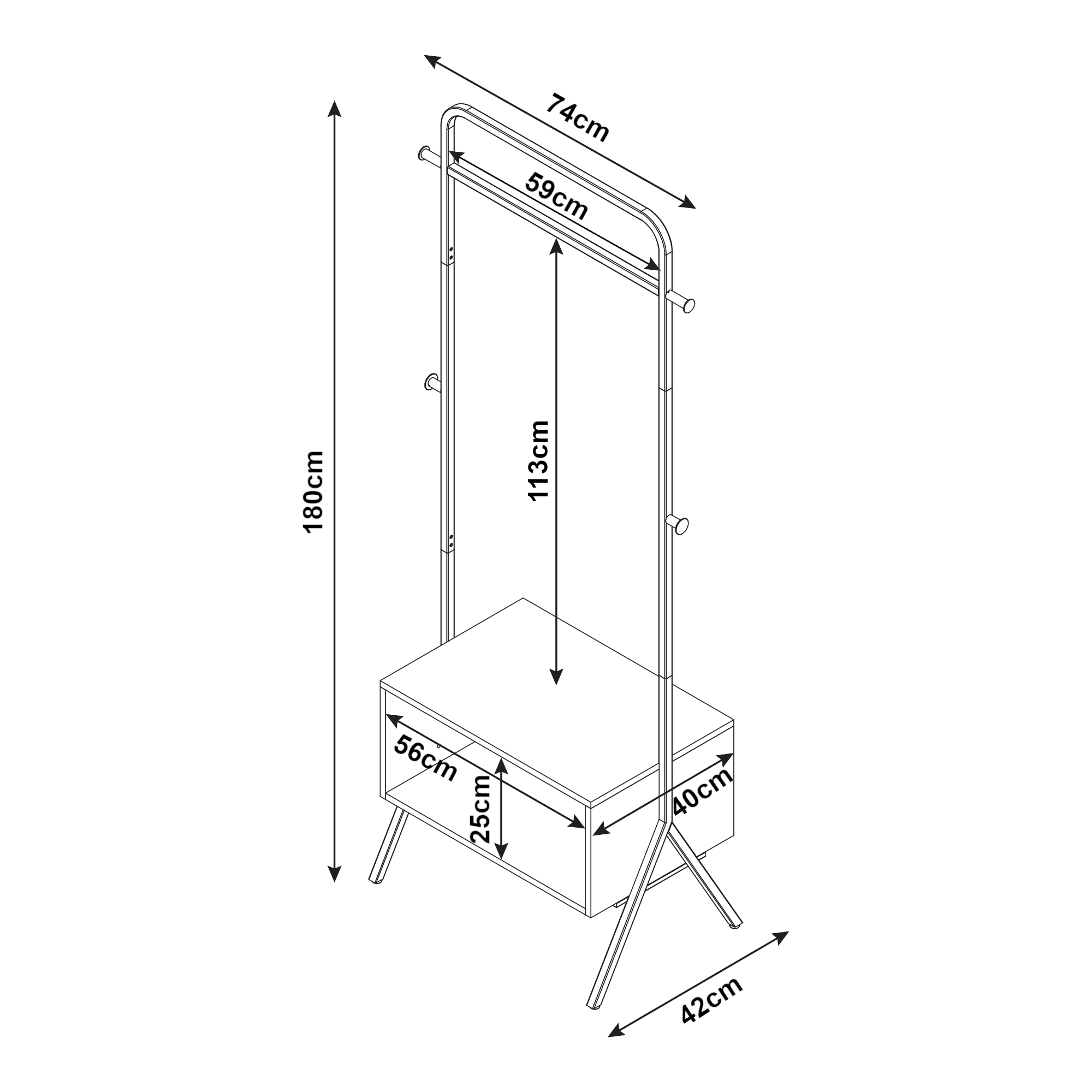 Die Kleiderstange bietet ausreichend Platz für Jacken, Mäntel, Schals und mehr. Das untere Ablagefach sorgt für einen weiteren Stauraum. Es bietet eine optimale Aufbewahrungslösung für Decken, Hausschuhe und andere Accessoires.