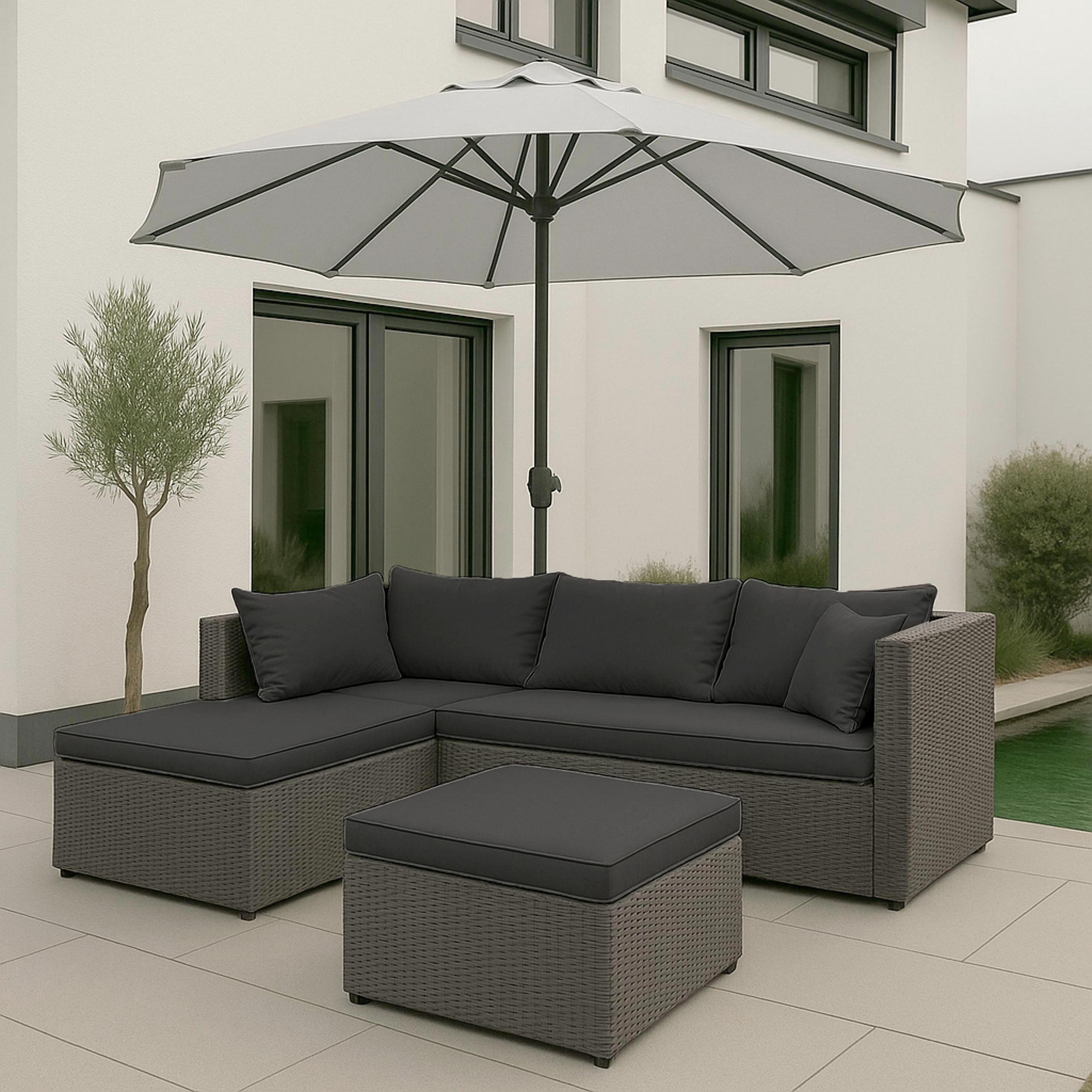 Genießen Sie entspannte Stunden im Freien und setzen Sie stilvolle Akzente mit dieser langlebigen und komfortablen Poly-Rattan Gartengarnitur – ideal für Garten. Terrasse oder Balkon.