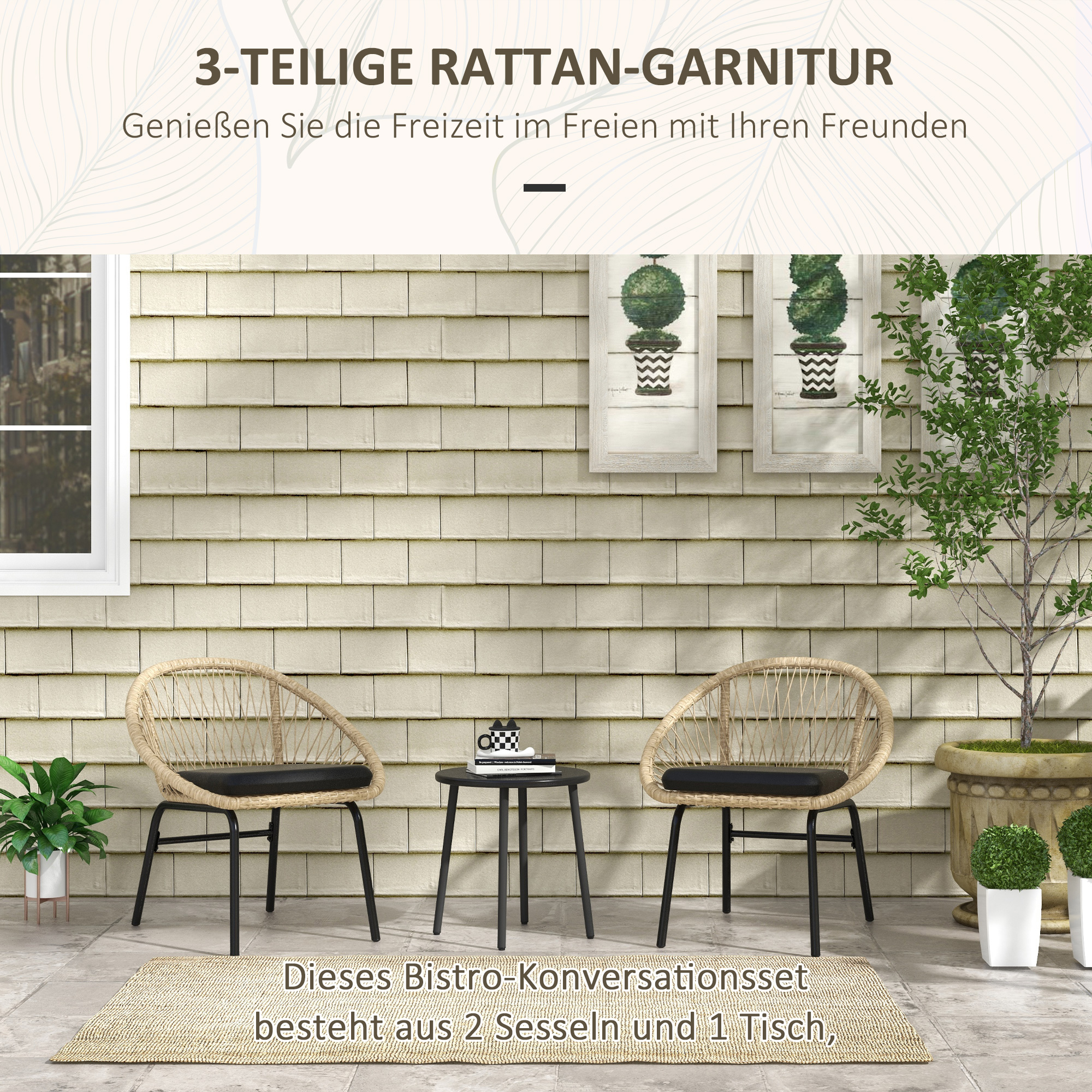 - Geniessen Sie gemütliche Stunden im Freien mit diesem 3-teiligen Terrassen-Bistro-Set. bestehend aus zwei runden. geflochtenen Stühlen und einem Couchtisch.
