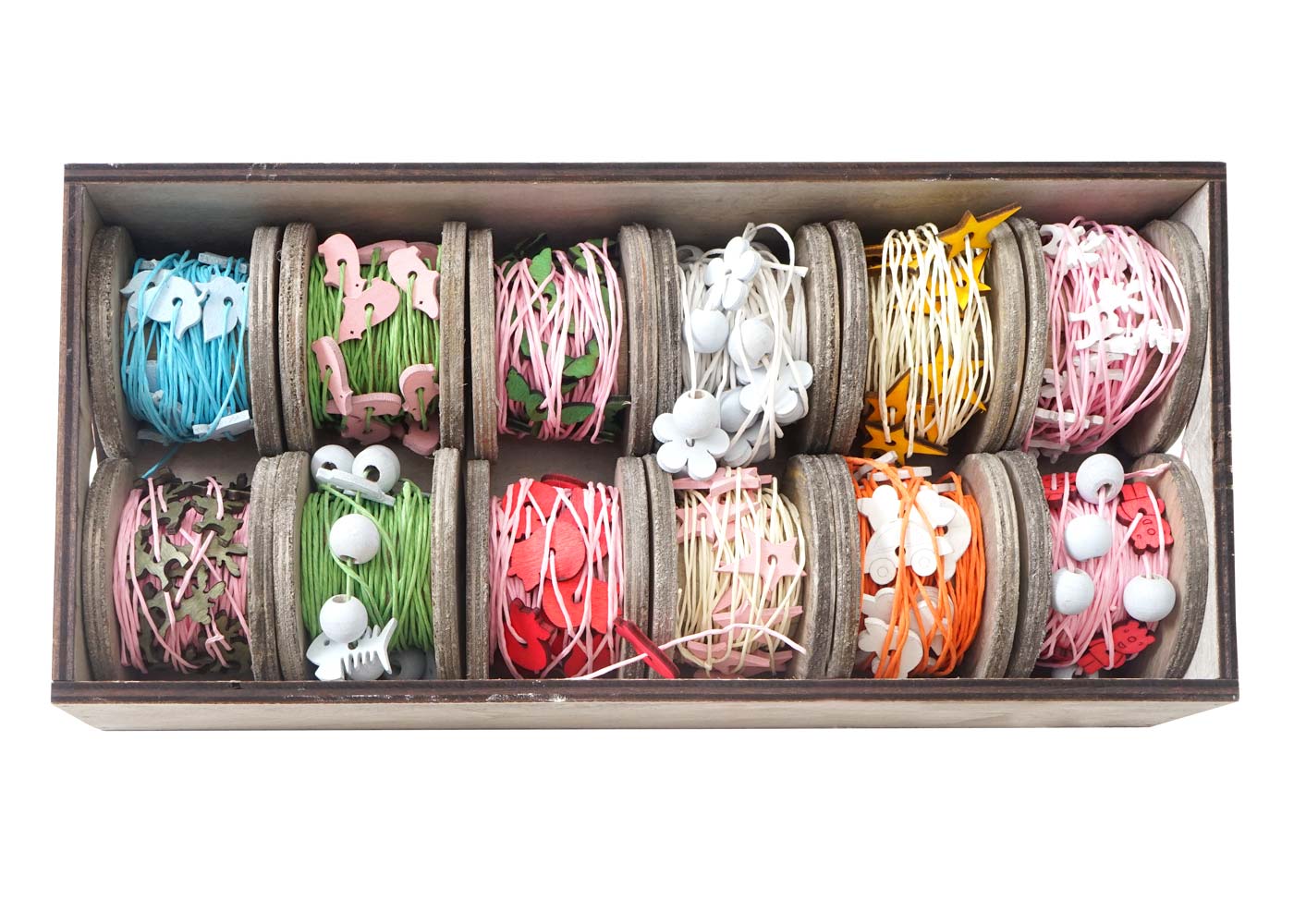 - 12 farbenfrohe Schnurrollen auf stabilen Holzrollen