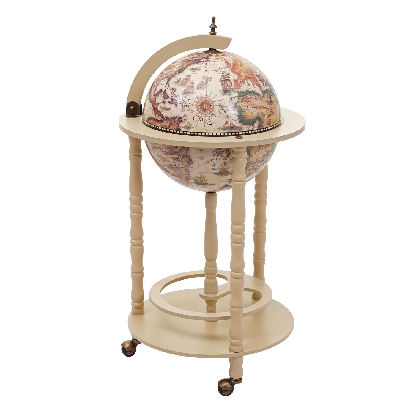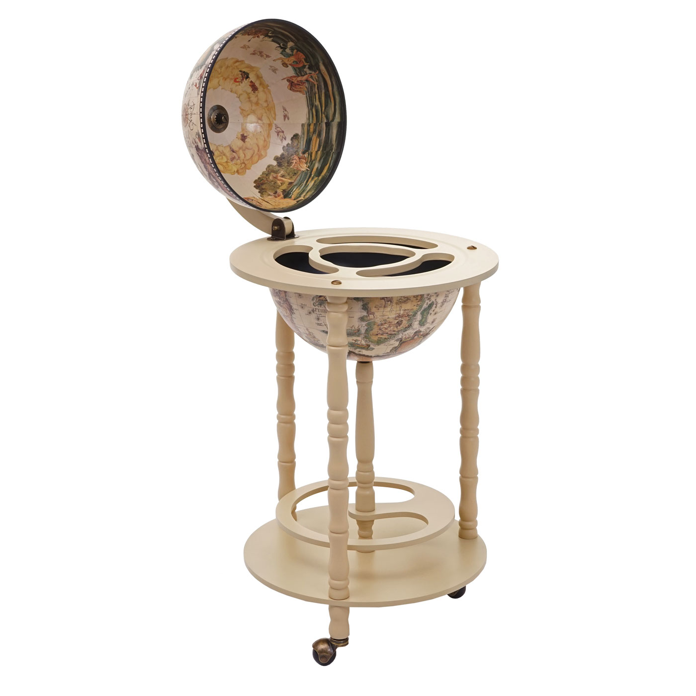 Diese extravagante Globus-Bar ist ein absoluter Hingucker und praktisch noch dazu: Sie lässt sich ganz einfach mit nur einem Handgriff öffnen, so dass Sie stets leichten Zugang zu allen benötigten Dingen haben und bietet ausreichend Platz, um mehrere Gläser und Flaschen darin zu verstauen. Durch die zusätzliche Ablage im unteren Bereich können noch weitere Flaschen untergebracht werden, so dass immer für ausreichend Nachschub gesorgt ist. Auch optisch hinterlässt die Bar einen bleibenden Eindruck: Die Außenseite ist mit einer antiken Weltkarte verziert, während auf der Innenseite ein Gemälde abgebildet ist. Und zu guter Letzt können Sie Ihren Wein im Zimmer Ihrer Wahl genießen, da die integrierten Rollen für Mobilität sorgen.