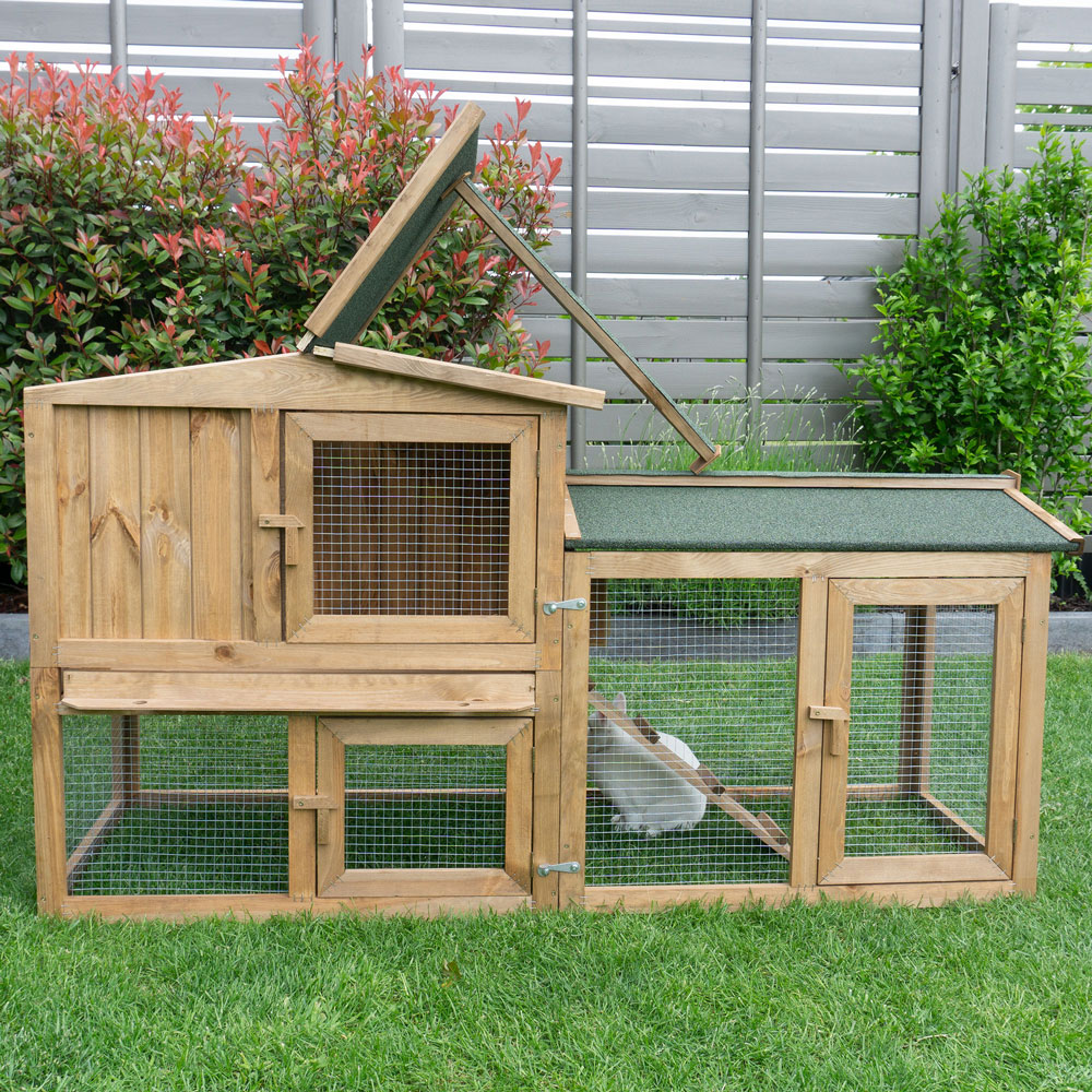 Der Anbau lässt sich einfach über zwei Haken an- und abkoppeln. So kann man den Stall nach Belieben umstellen und viel leichter reinigen. Der Anbau hat zusätzlich eine große Tür und der Freilauf unter dem Stallbereich ebenfalls. So kommt man leicht in jede Ecke. Über eine praktische Hasentreppe geht es hoch in den Stallbereich. Dieser hat nach vorne eine Drahttür für ausreichend Tageslicht und frische Luft.