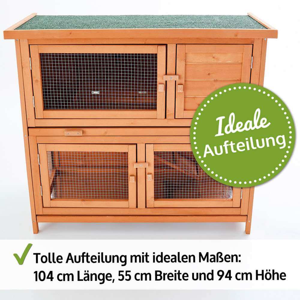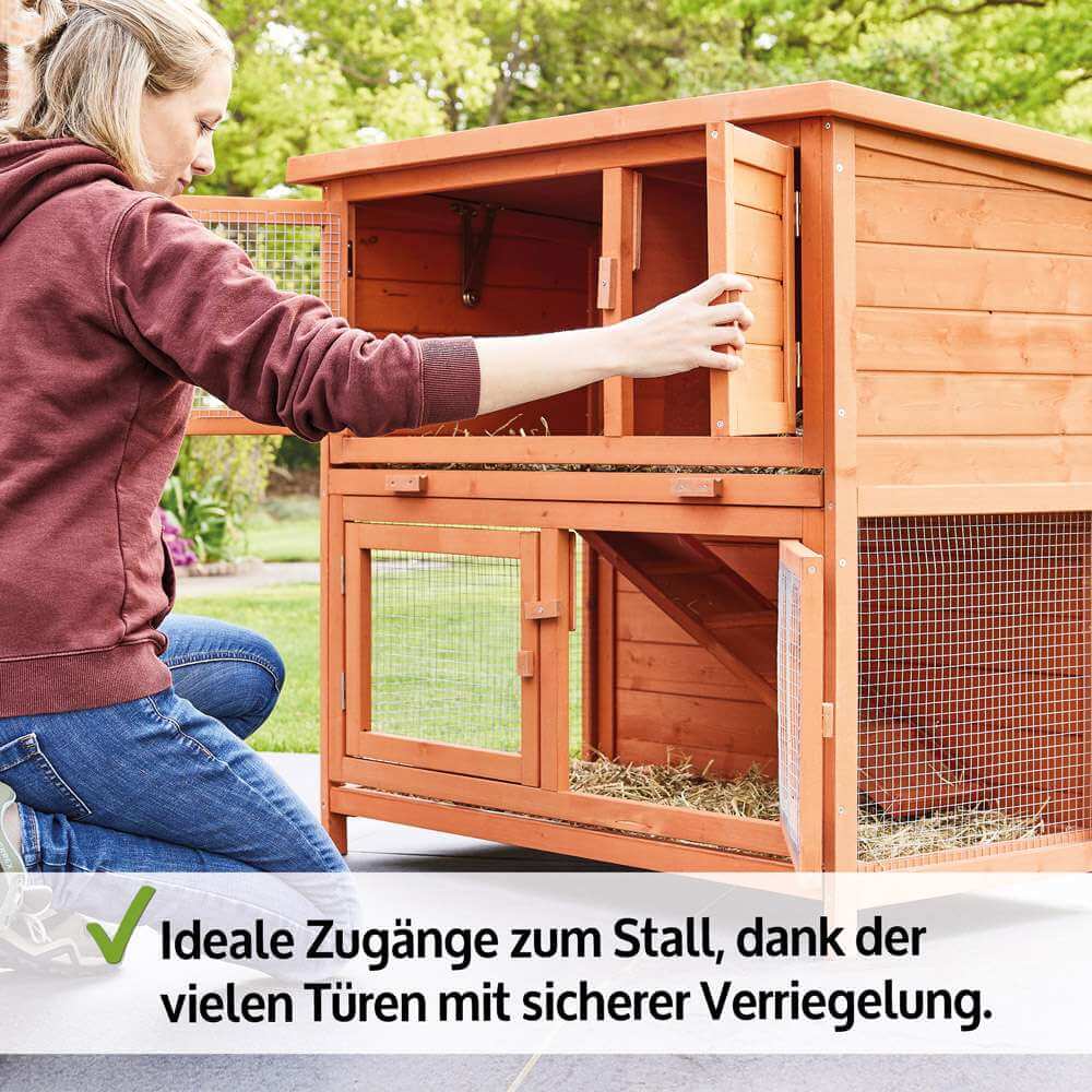 Die untere Etage ist seitlich und nach vorne mit Draht ausgestattet und hat 2 Flügeltüren. So haben die Kaninchen viel frische Luft und einen schönen Ausblick und Sie können gut in den Stall greifen oder Ihre Tiere mal ein bisschen hoppeln lassen. Der obere Bereich ist hinten und seitlich geschlossen. Links haben die Tiere einen freien Blick nach vorne und rechts ist hinter einer Trennwand ein separater Rückzugsbereich mit Holztür. Hier können die Hasen lichtgeschützt im Stroh dösen oder nisten. Alle 4 Türen sind mit einem kleinen Riegel zu verschließen.