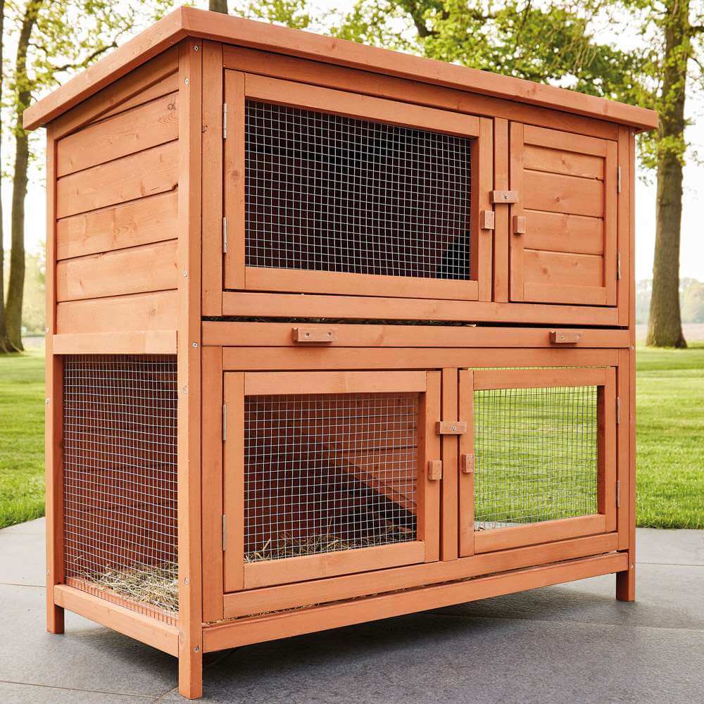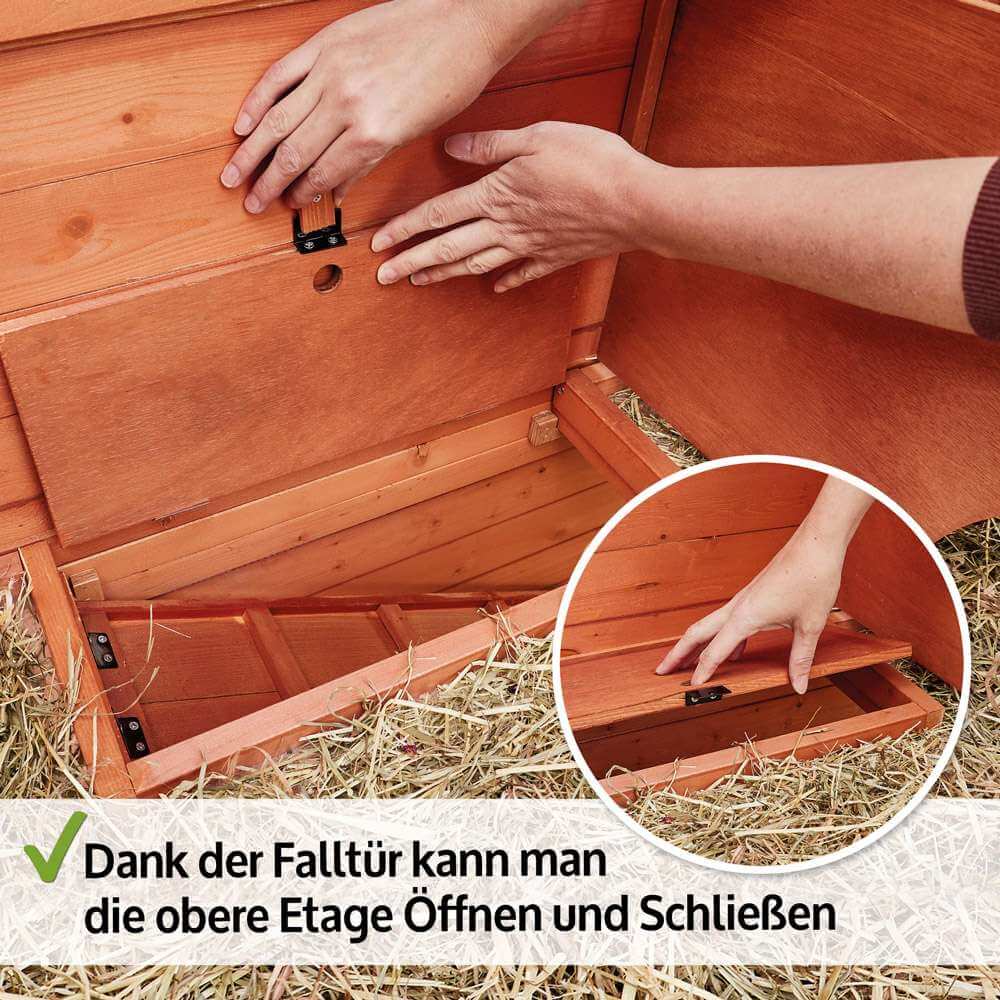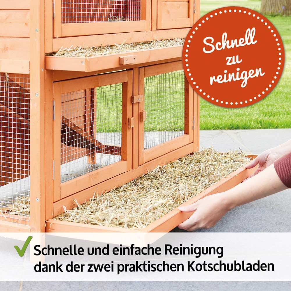 Über 2 Etagen können die Nager sich austoben. Unter beiden Etagen befindet sich jeweils eine Kotschublade zur schnellen, einfachen Reinigung. Die Tiere können über eine rutschfeste Rampe zwischen den Etagen wechseln. Die Rampe kann mit einer kleinen Holzklappe verschlossen werden. So können Sie Ober- und Unteretage voneinander trennen.