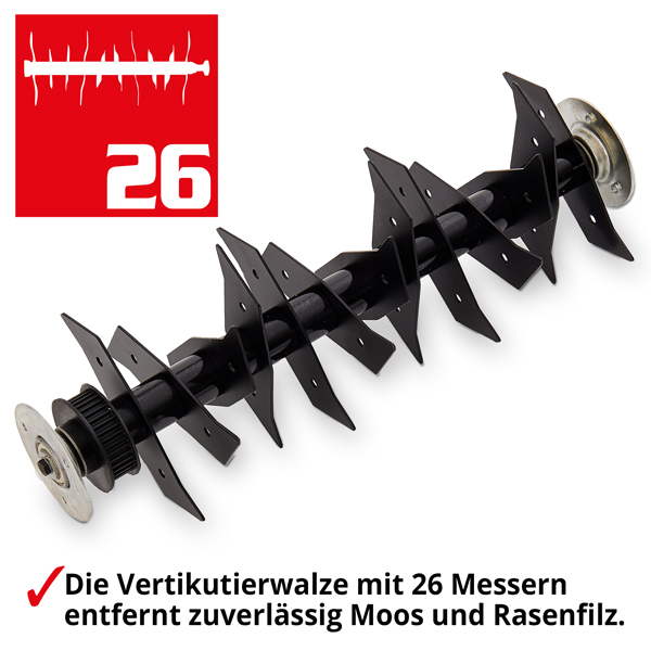 • Vertikutierwalze mit 26 Messern (13 Doppelmesser) für gründliche Rasenpflege