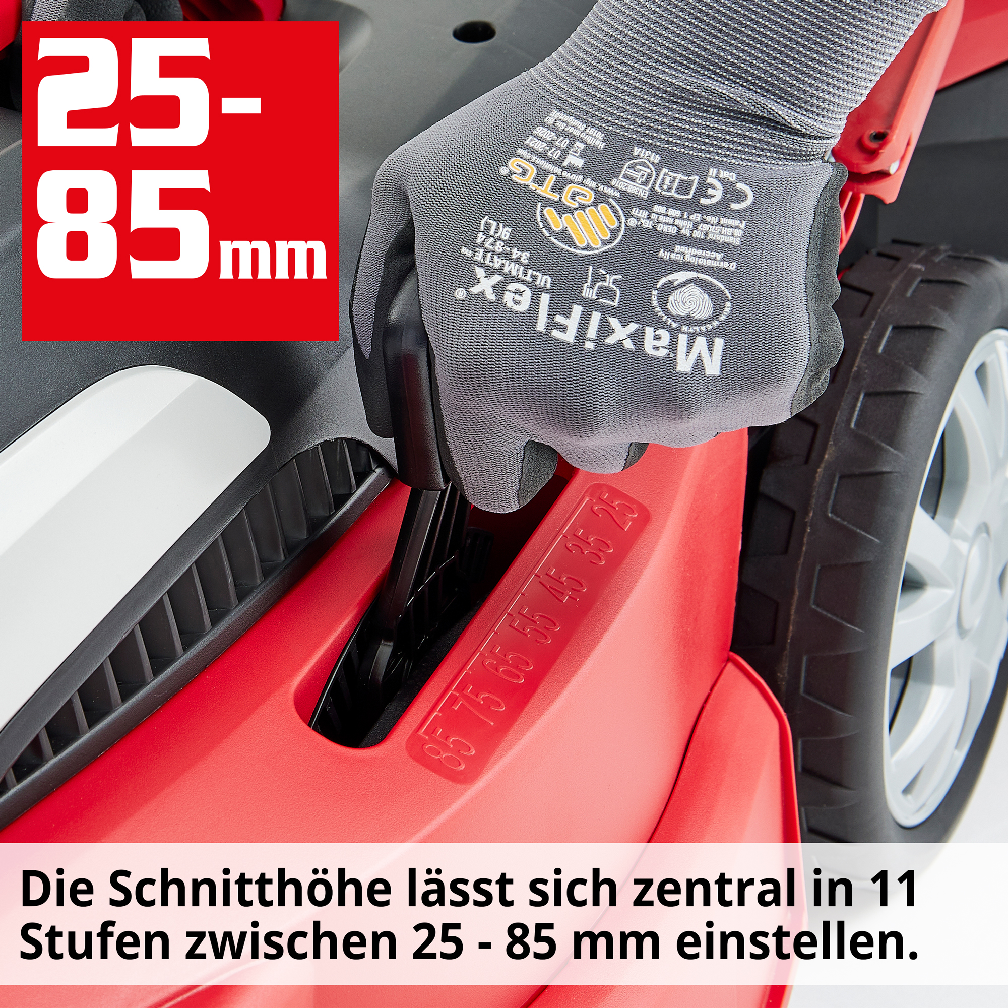 • Die Schnitthöhe kann zentral zwischen 25 mm und 85 mm eingestellt werden.