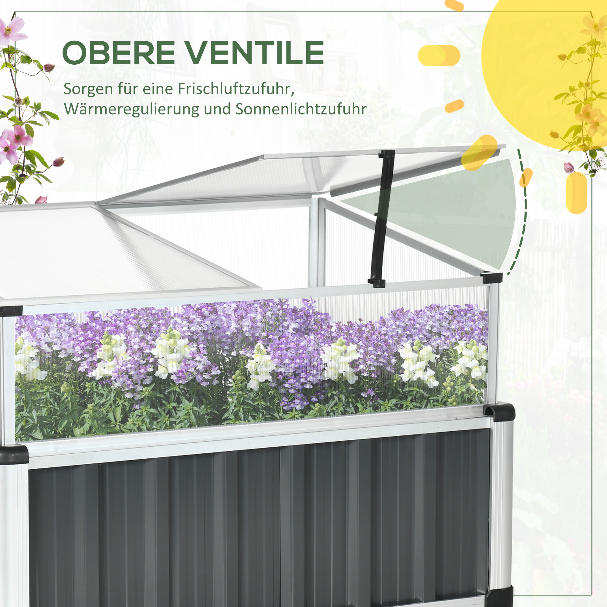 - Die obere Abdeckung kann geöffnet werden, um die Temperatur des Gewächshauses zu regulieren und eine gute Belüftung zu gewährleisten