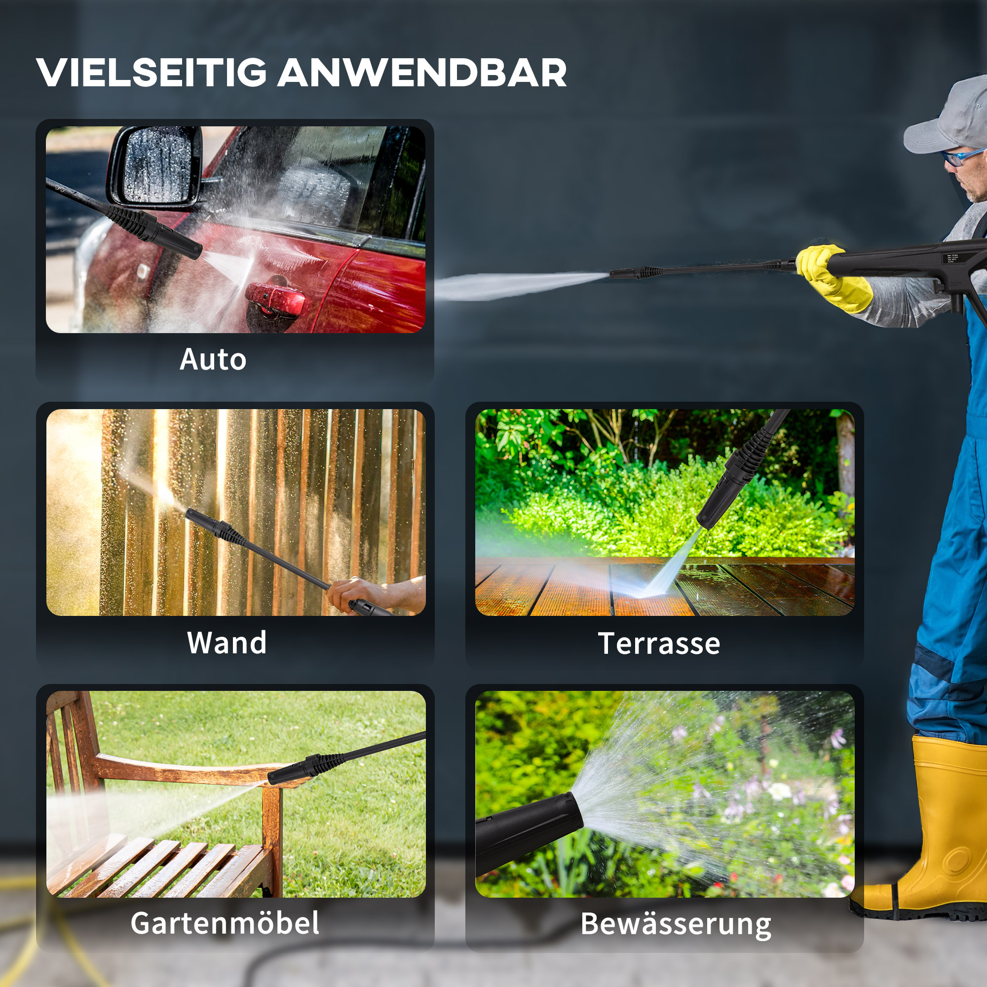 Für eine gründliche Reinigung von Fahrzeugen. Aussenwänden und Gartenmöbeln bietet dieser tragbare Hochdruckreiniger hervorragende Leistung. Mit einem 1800-Watt-Motor. einem Maximaldruck von 150 bar und einem Durchfluss von bis zu 510 Litern pro Stunde entfernt er mühelos hartnäckige Verschmutzungen. Der 6 Meter lange Schlauch und das 5 Meter lange Stromkabel erleichtern die Handhabung. während die Räder für eine einfache Mobilität sorgen.