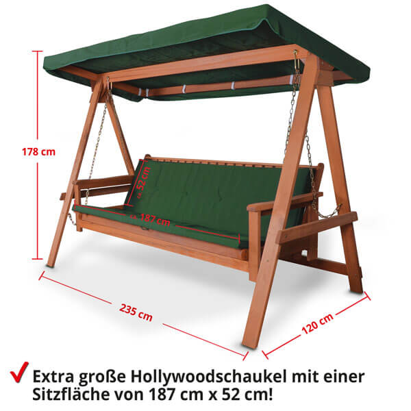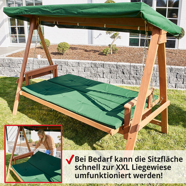 Robuste Metall-Ösen garantieren dauerhaft sicheren Halt, während das pflegeleichte Material für eine lange Lebensdauer sorgt. Die Hollywoodschaukel bietet Platz für bis zu vier Personen und ist bis 300 kg belastbar – perfekt für entspannte Momente mit Familie oder Freunden.
