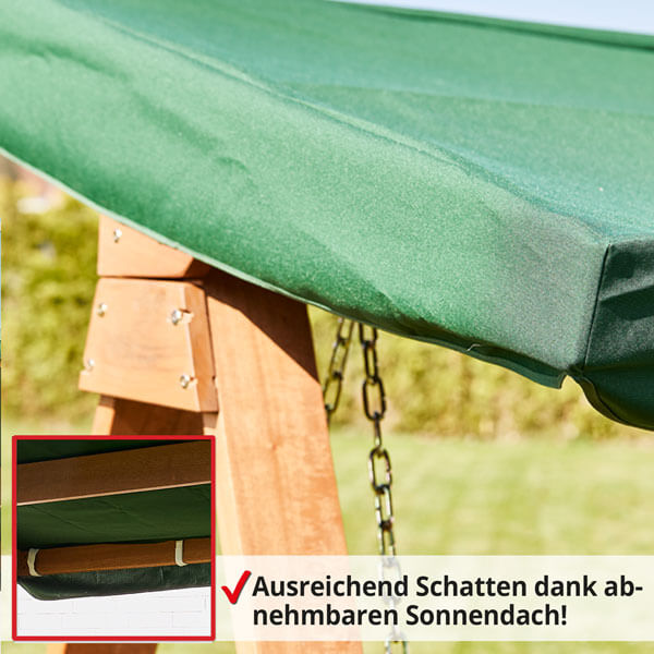 Dank der verstellbaren Rückenlehne verwandeln Sie die großzügige Sitzfläche (ca. 183 cm breit) im Handumdrehen in eine komfortable Liege – ideal für ein kurzes Nickerchen oder ein gutes Buch. Das abnehmbare Sonnendach schützt zuverlässig vor direkter Sonneneinstrahlung und sorgt für angenehmen Schatten.