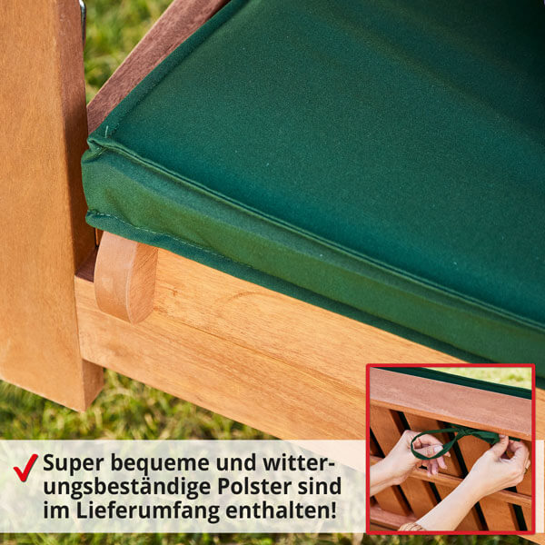 Gefertigt aus massivem Merantiholz, überzeugt das Gestell durch hohe Stabilität, Langlebigkeit und eine warme, natürliche Optik. Das klassisch-zeitlose Design fügt sich harmonisch in jeden Garten oder auf jede Terrasse ein und wird durch die grüne Polster-Auflage geschmackvoll ergänzt.